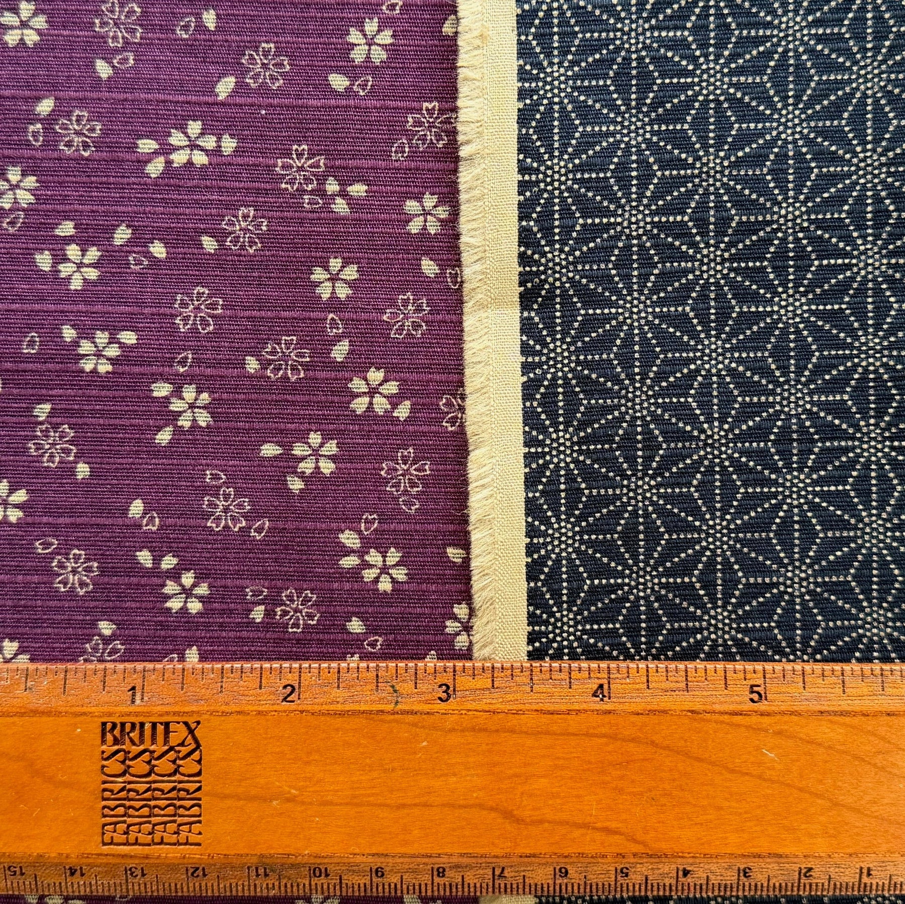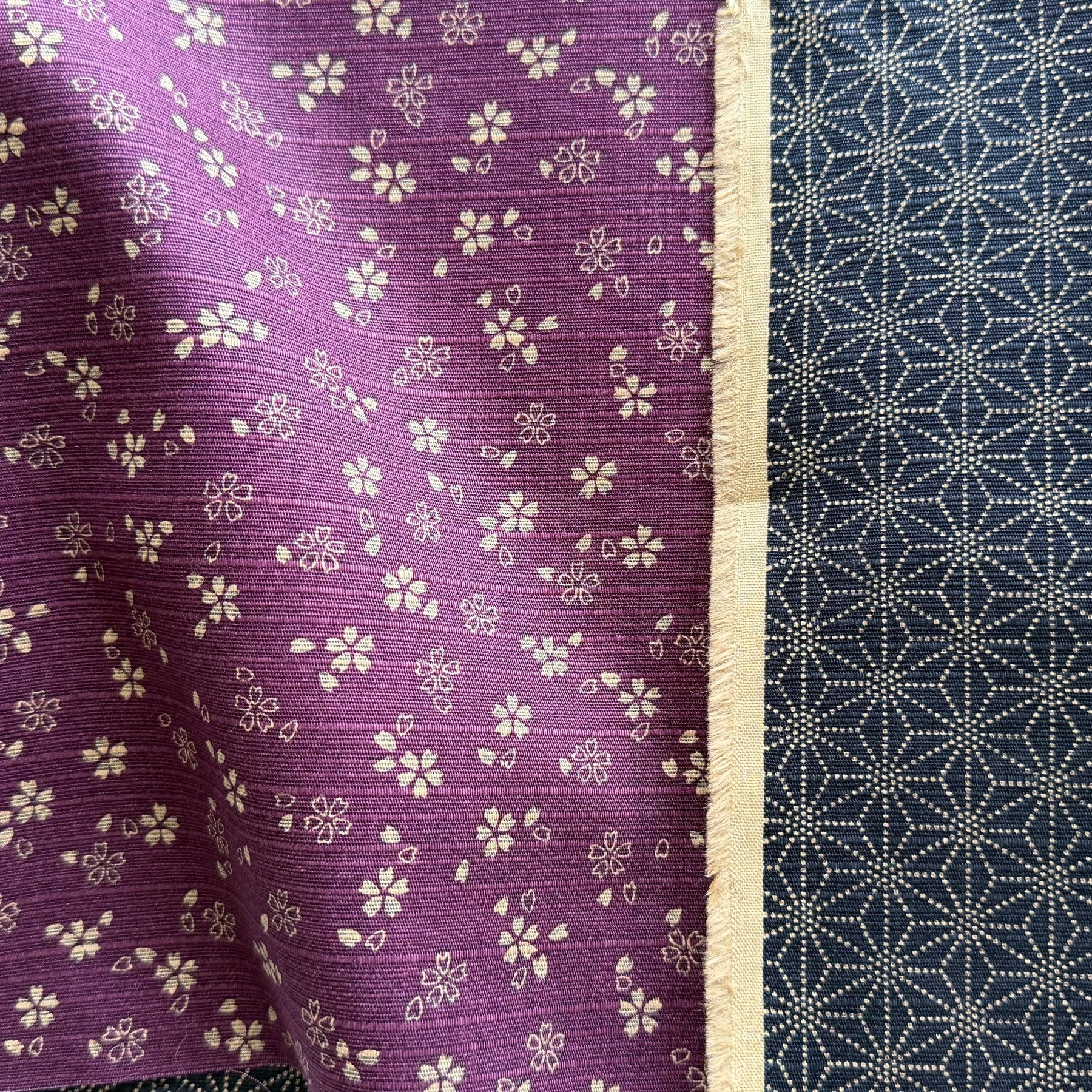 A reversible dobby cotton with a plum sakura or cherry blossoms pattern and the reverse has an indigo asanoha or star pattern - this print is perfect for full skirts, blouses, totes, or a lighter weight jacket. Made in Japan. 100% cotton. 44" wide.