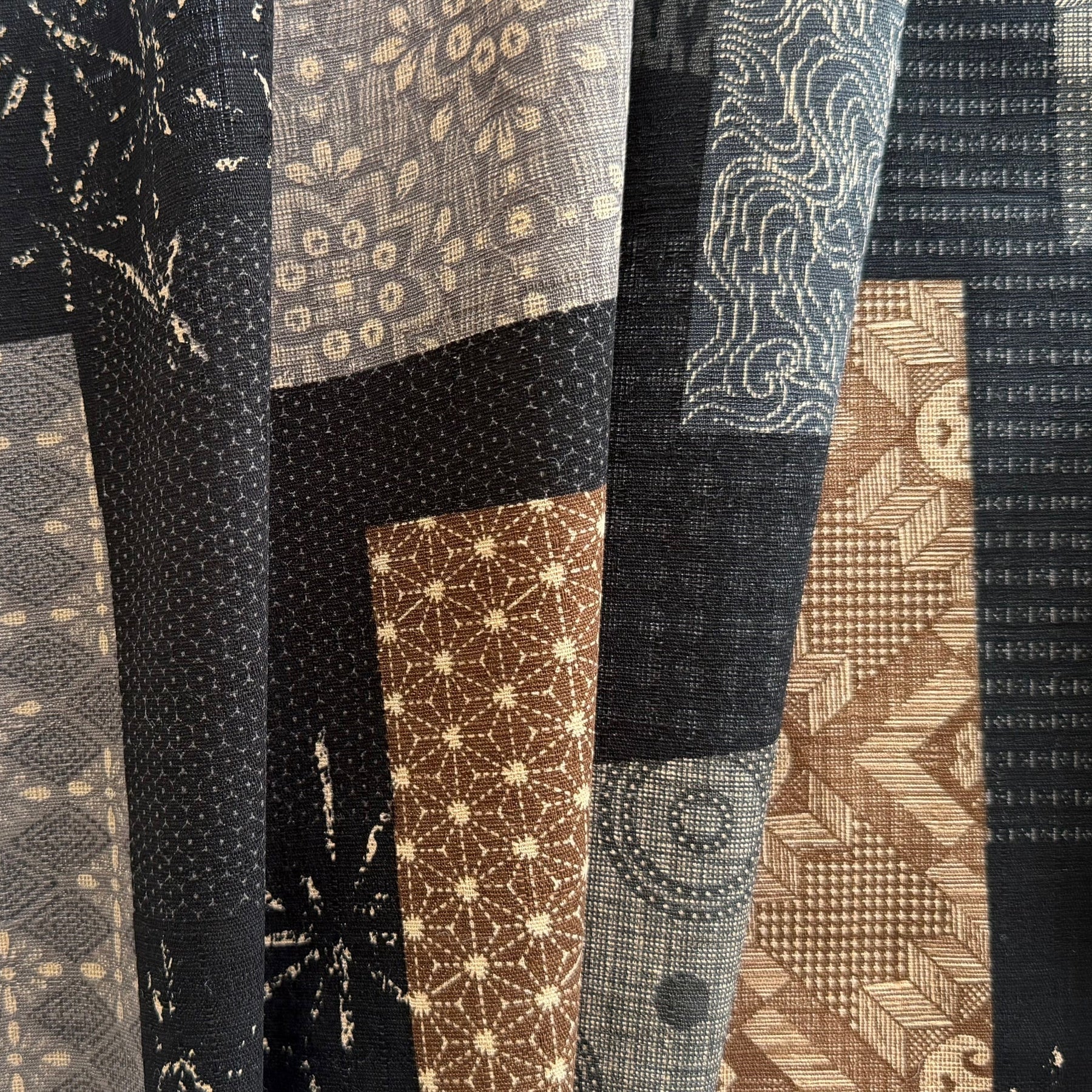 A dobby cotton with a traditional style patchwork or boro print in shades of black, grey, and caramel - this print is perfect for full skirts, blouses, totes, or a lighter weight jacket. Made in Japan. 100% cotton. 44" wide.