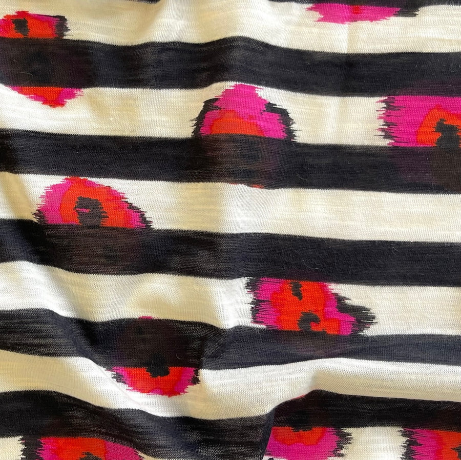 A high-end lightweight cotton tissue jersey knit with crosswise black and natural stripes hiding cherry and fuchsia flowers - this buttery soft knit is perfect for a knit top, scarf, or comfortable sleepwear. Made in Japan. 100% cotton. 56" wide.