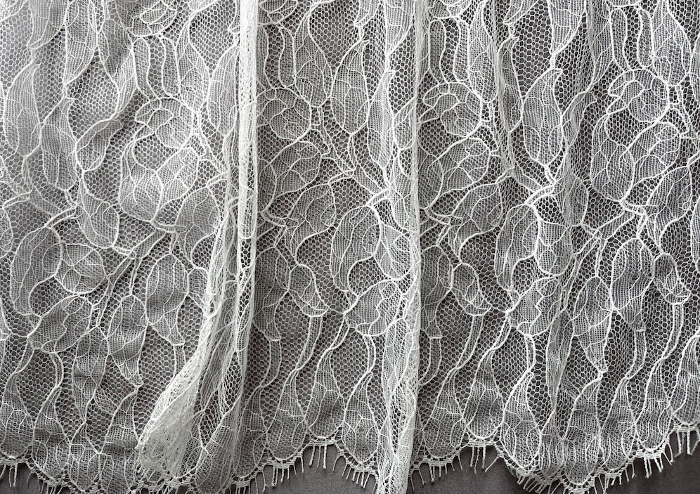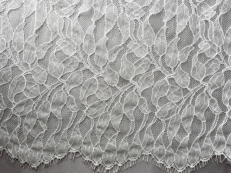 A delicate Chantilly lace fabric in soft white, with a romantic vining leaves pattern and double scallops - soft and drapey, this lace is perfect for special occasions, bridal wear, and lingerie. Made in USA. 100% poliamide. 48" wide.