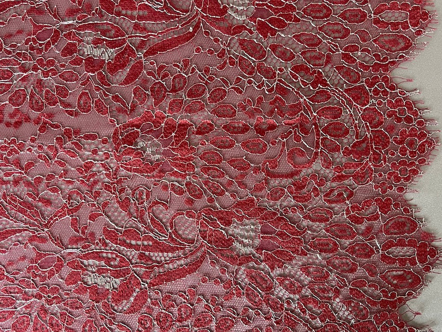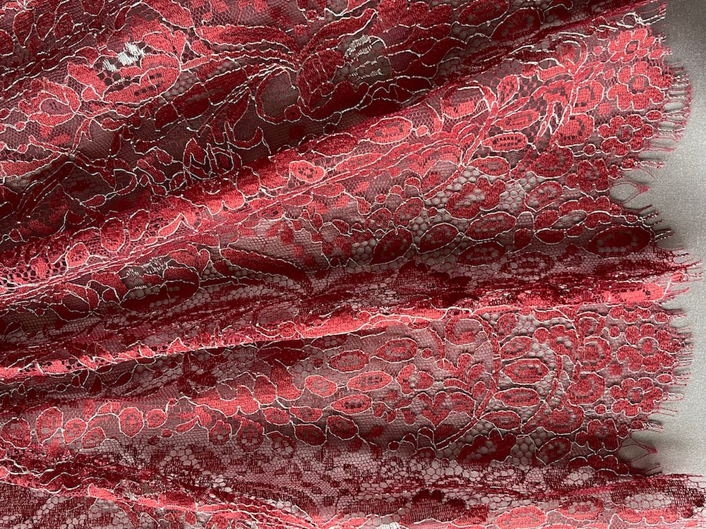 A Chantilly lace fabric in garnet red and silver metallic, with an allover floral pattern, double scallops, and eyelash trim - soft and drapey, this beautiful lace is perfect for blouses or full skirts. Made in USA. 55% poliamide and 45% rayon blend. 54" wide.