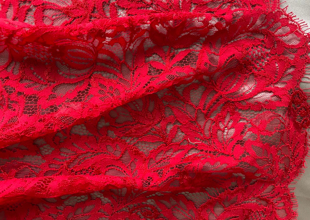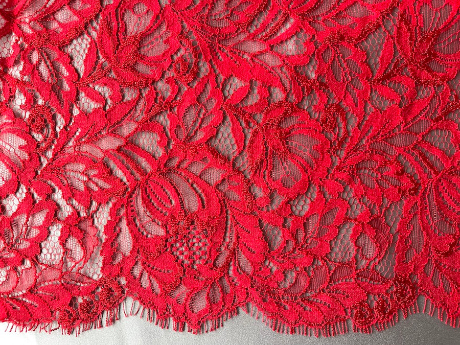 A Chantilly lace fabric in sensuous cherry red, with an allover floral pattern and double scallops - soft and drapey, this beautiful lace is perfect for special occasions or a top. Made in USA. 55% poliamide and 45% rayon blend. 40" wide.