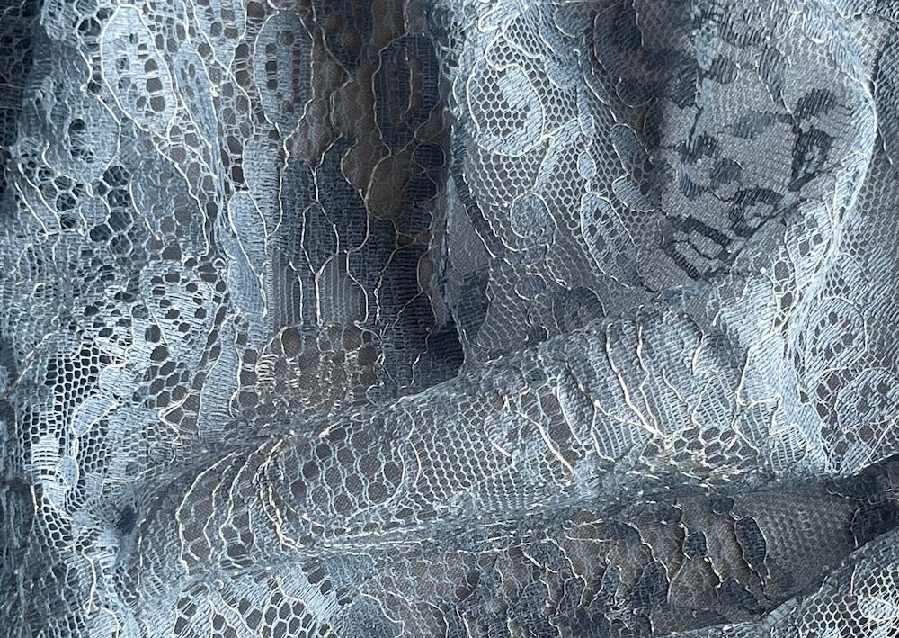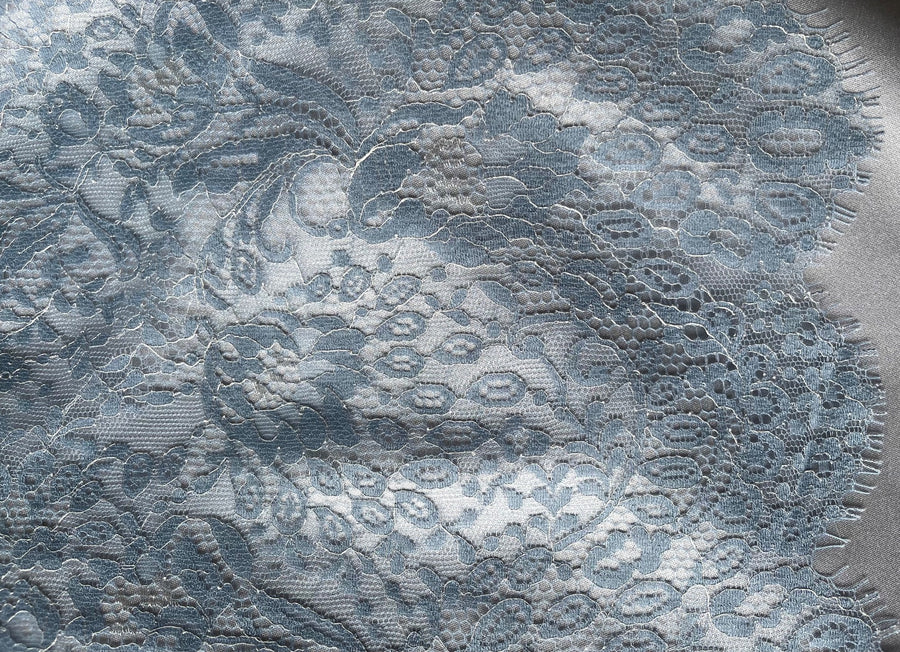 A Chantilly lace fabric in shimmery ice blue and silver metallic, with an allover floral pattern, double scallops, and eyelash trim - soft and drapey, this beautiful lace is perfect for blouses, tunics, or full skirts. Made in USA. 55% poliamide and 45% rayon blend. 54" wide.