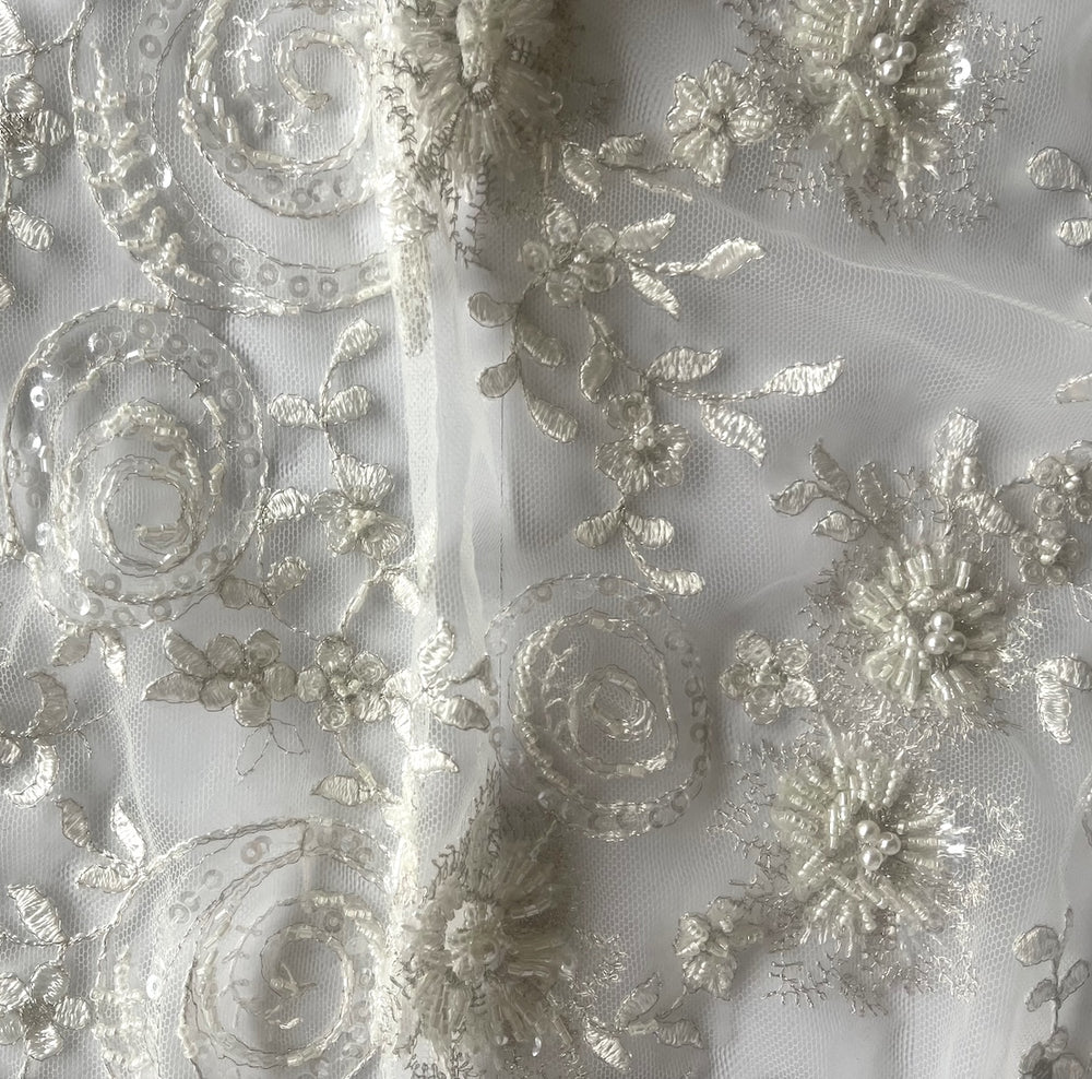 An elegant white mesh fabric embroidered with off-white flowers, adorned with pearls, sequins, and subtle metallic silver accents, and with lush scallops on both selvedges - this romantically spectacular embroidered mesh is perfect for bridal wear, jackets, or skirt overlays. Made in Korea. 52" wide.