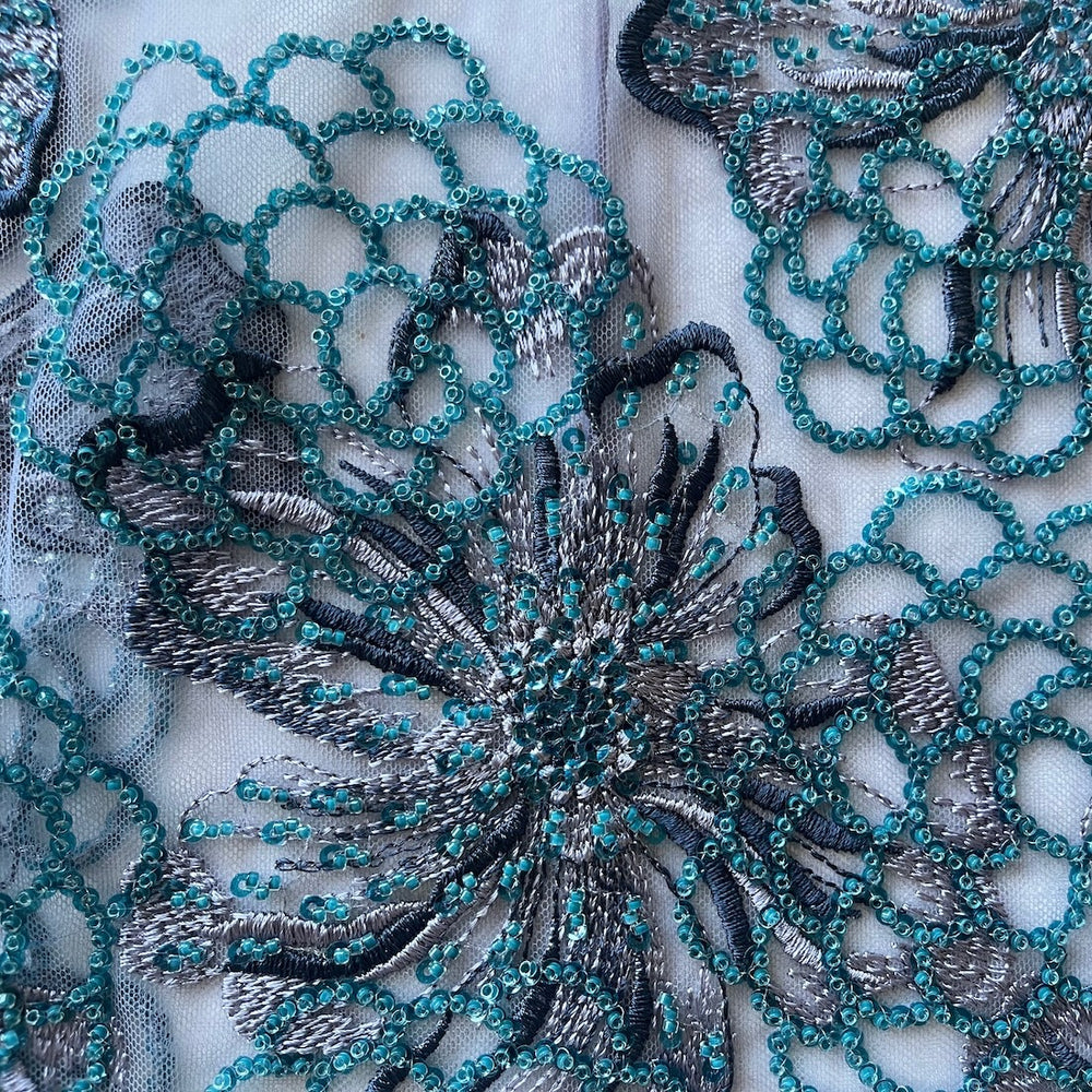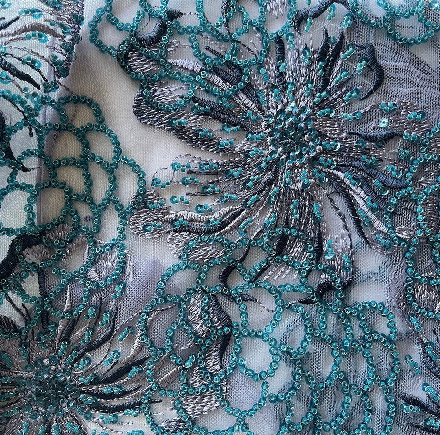 Embroidered Teal Blooms on Beaded & Sequined Amethyst Nylon Mesh (Made in Korea)