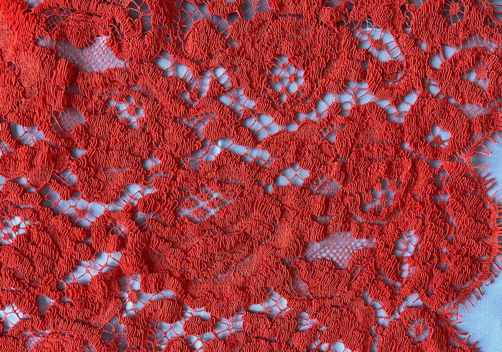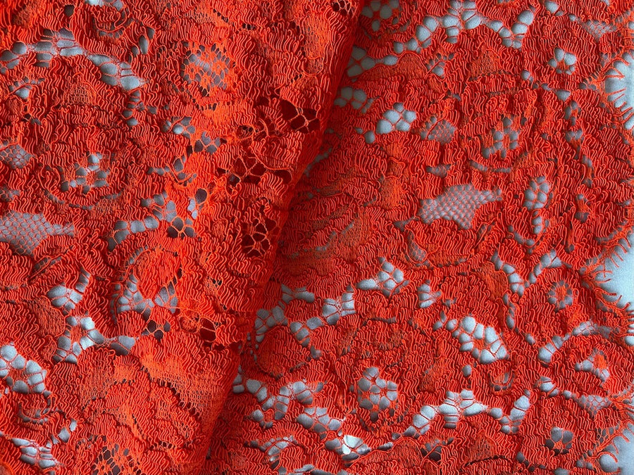A corded Alençon lace fabric in a fresh sunset vermillion all-over floral with scalloped edges - perfect for tops, special occasions, sheath dresses, and wraps. Made in France. 70% cotton, 26% viscose, and 4% polyamide blend. 100% polyester. 41" wide.
