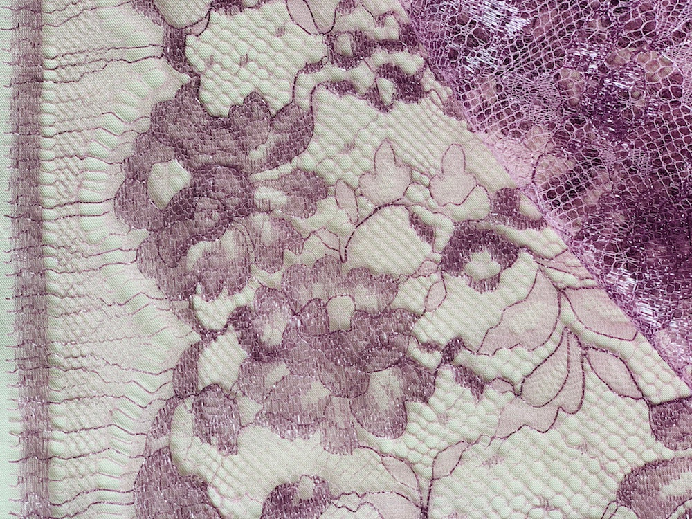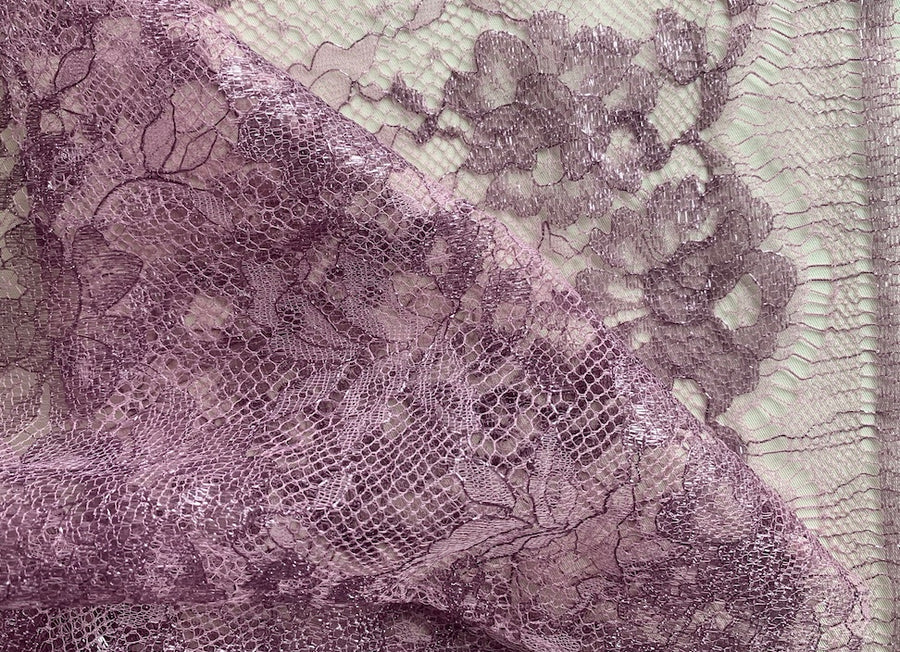 A beautiful lace fabric in lilac. A romantic all-over floral with a metallic sheen and scalloping on both selvedges, this is perfect for an elegant sheath dress, a top, or a jacket. Made in France and used by Gucci. Poliamide and acrylic blend. 38" wide.