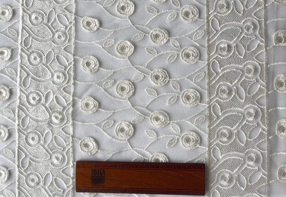 A lace tulle fabric in pale ivory with embroidered vining flowers in lengthwise stripes - this beautiful lace is perfect for a sheath dress or a romantically alluring blouse. Polyester and nylon. 39" wide.