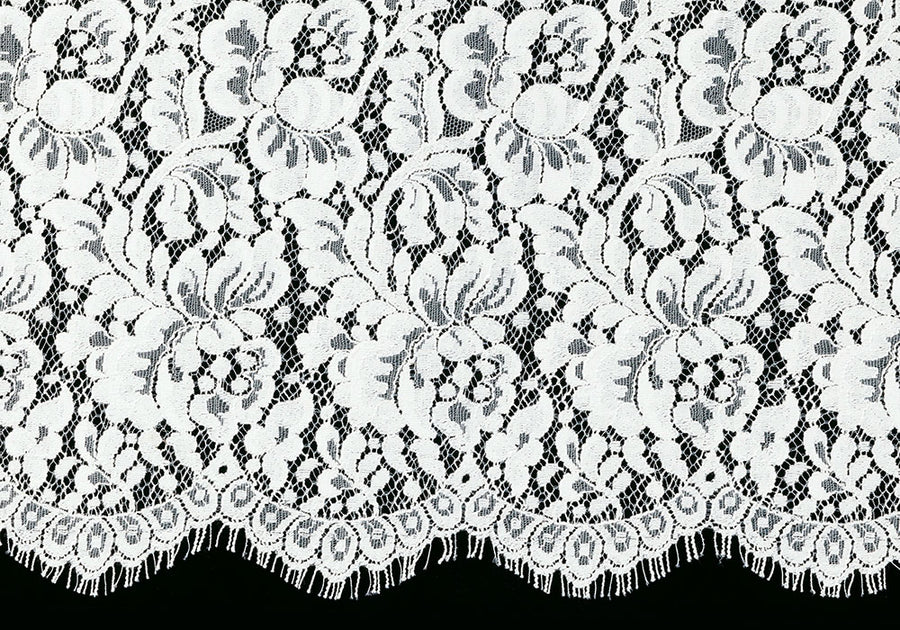 A pale ivory Chantilly lace fabric - a floral design that's scalloped on both selvedges, with eyelash trim. Made in USA. 60% cotton, 17% poliamide, and 23% rayon blend. 44" wide.