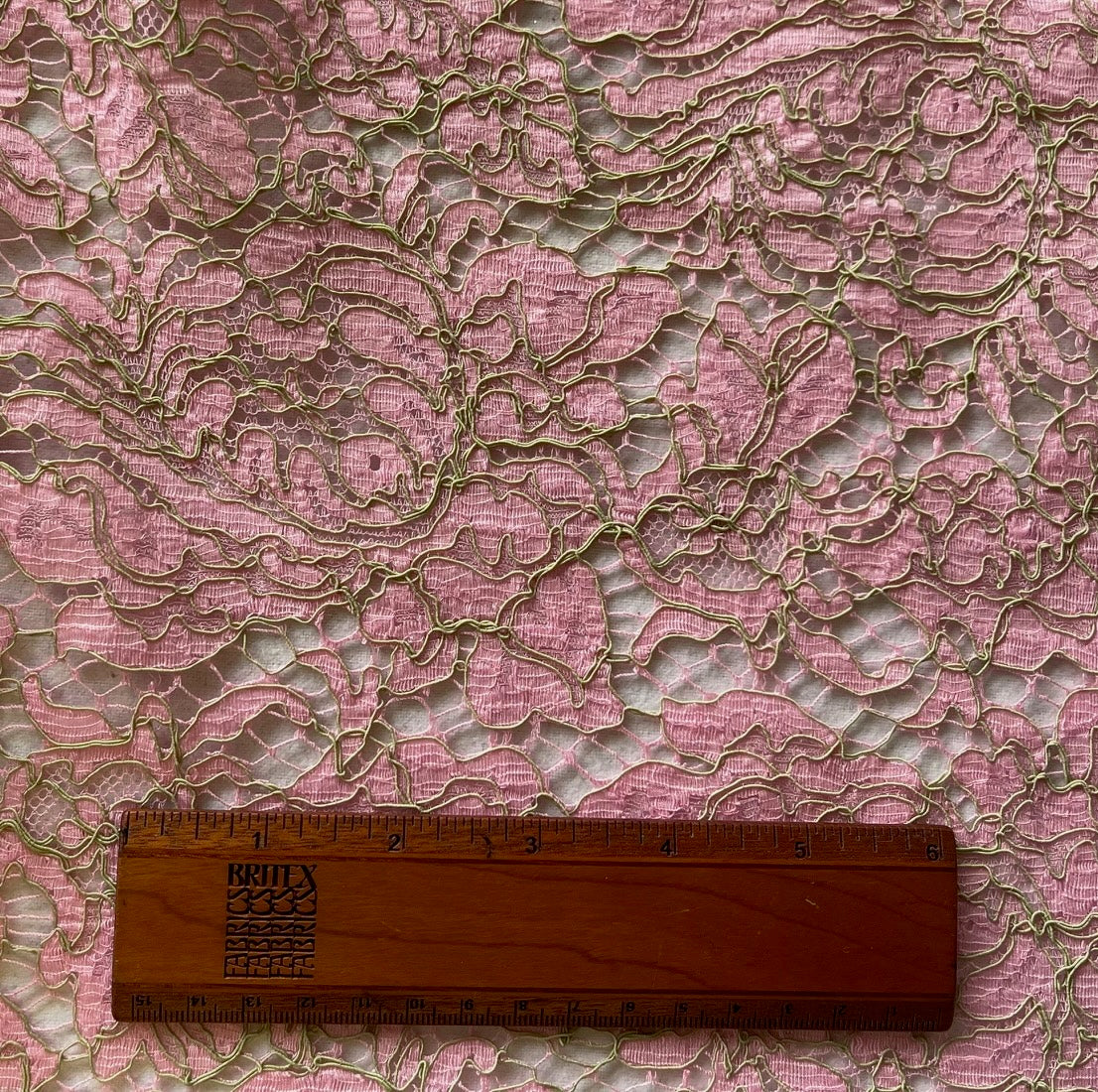 A cotton blend floral Alençon lace fabric in a modern peppermint pink with key lime corded accents and scalloped on both selvedges - this lace fabric is perfect for tops, skirts, or evening wear. Made in Italy. 83% cotton, 10% viscose, and 7% nylon. 35" wide.