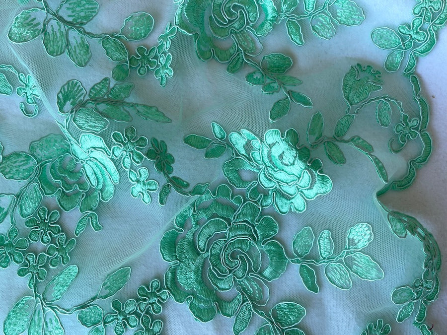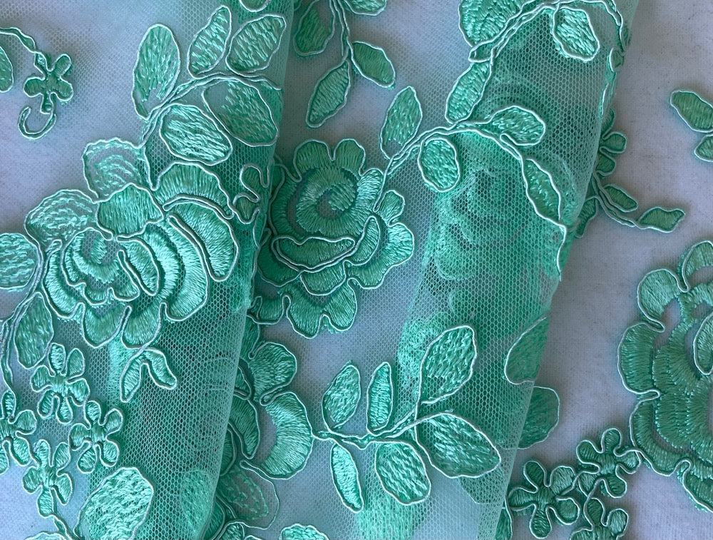 A poliamide blend corded Alenćon lace fabric of crème de mint flowers on pale mint mesh, and with scallops on each selvedge - this soft, romantic lace fabric is perfect for tops, party dresses, or boho blouses. Made in Korea. Poliamide and viscose. 51" wide.