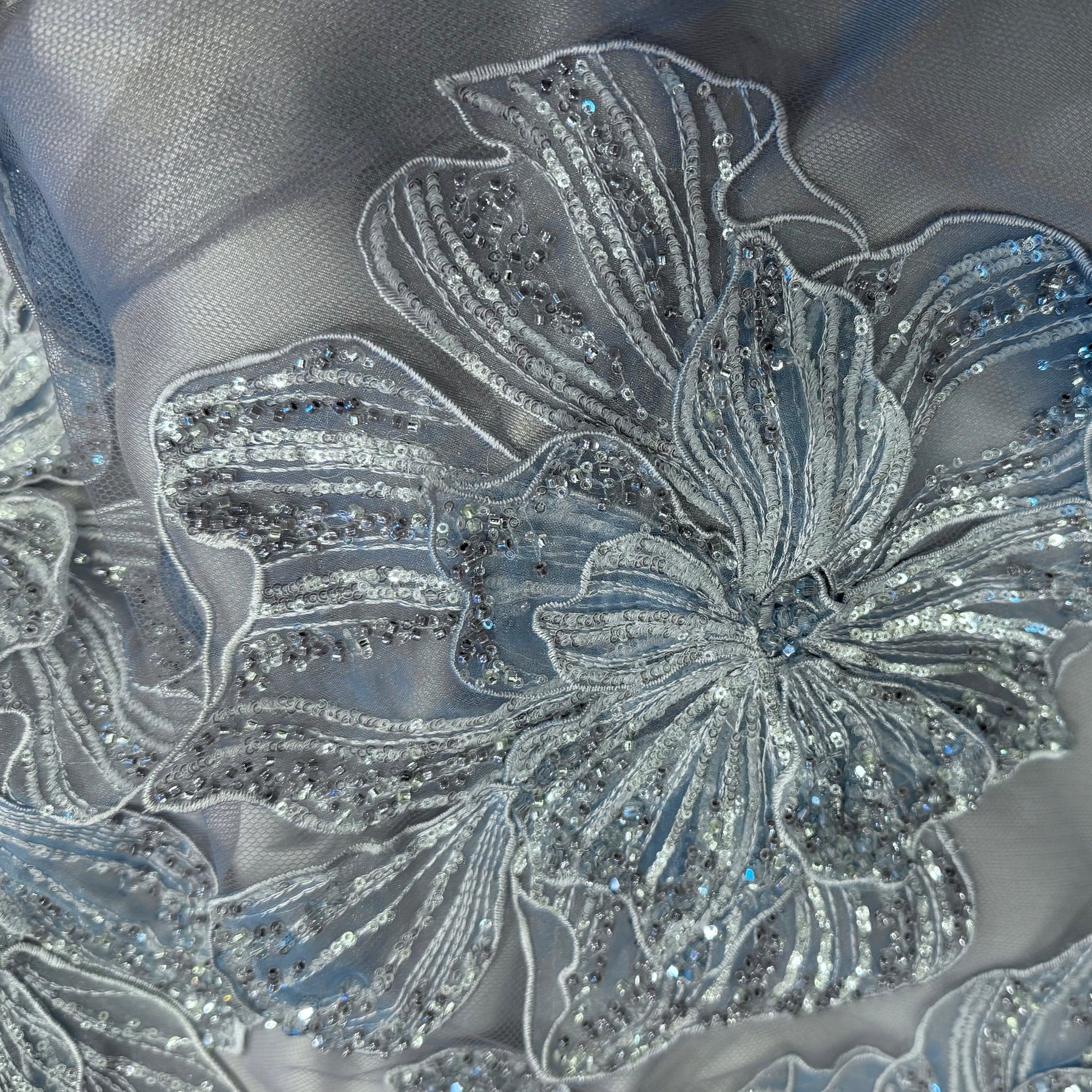 A soft stunning slate blue tulle with ice blue beaded, sequined, and embroidered gorgeous furled flowers strewn across the tulle  - this ornately amazing, semi-sheer shimmery fabric is perfect for a cocktail dress, a tunic, or a wrap. Made in Korea. Polyester and nylon. 52" wide.