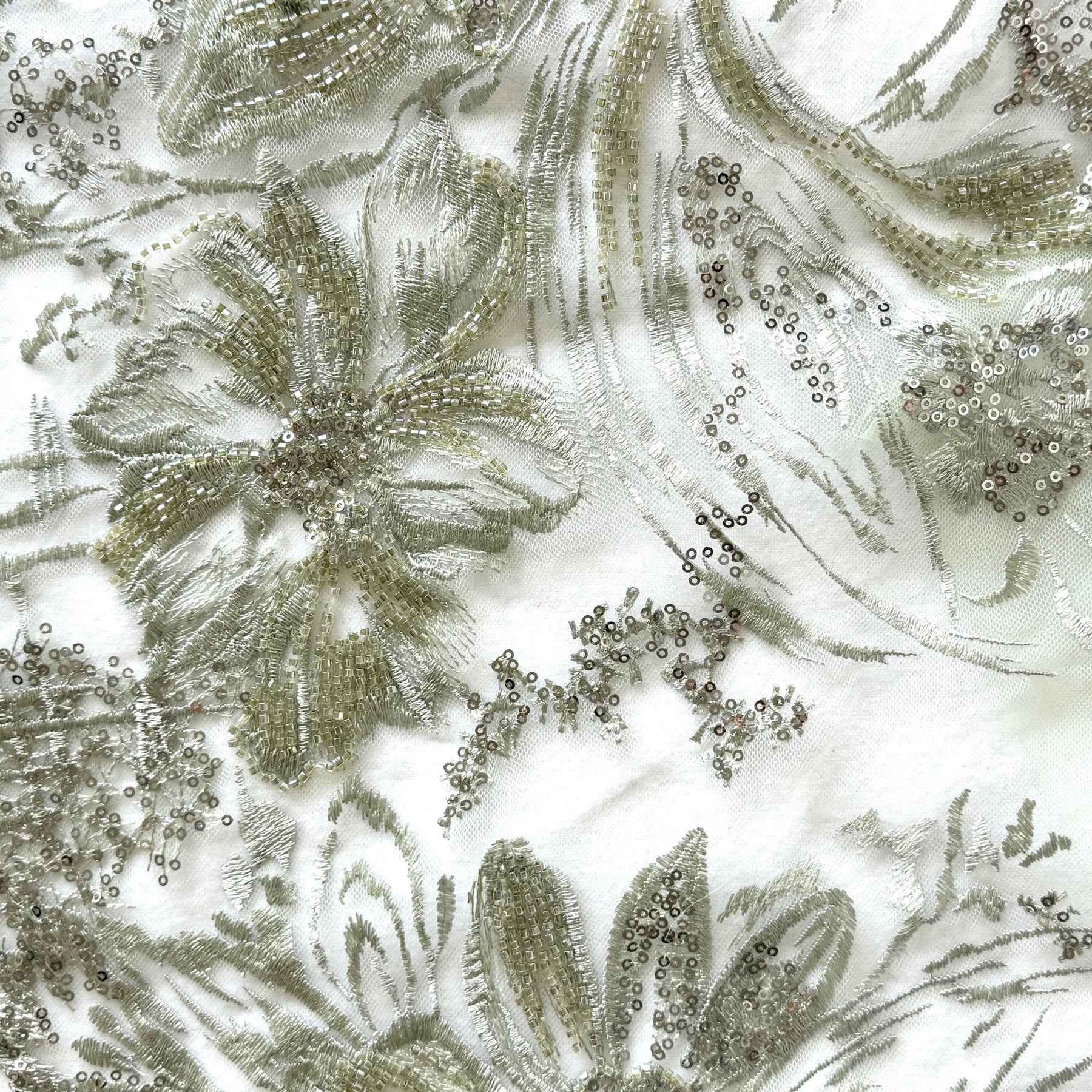 A soft, stunning pale grey tulle with beaded, sequined, and embroidered gorgeous seaside foliage in shades of jade green strewn across the tulle - this ornately ethereal, shimmery fabric is perfect for a cocktail dress, a tunic, or a wrap. Limited yardage. Made in Korea. Polyester and nylon. 48" wide.