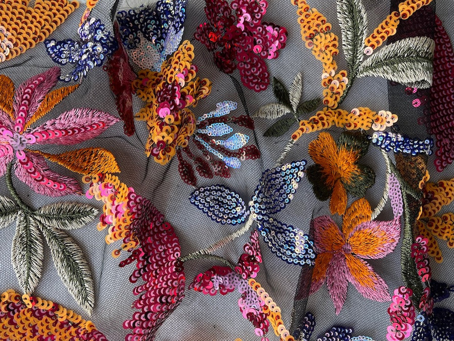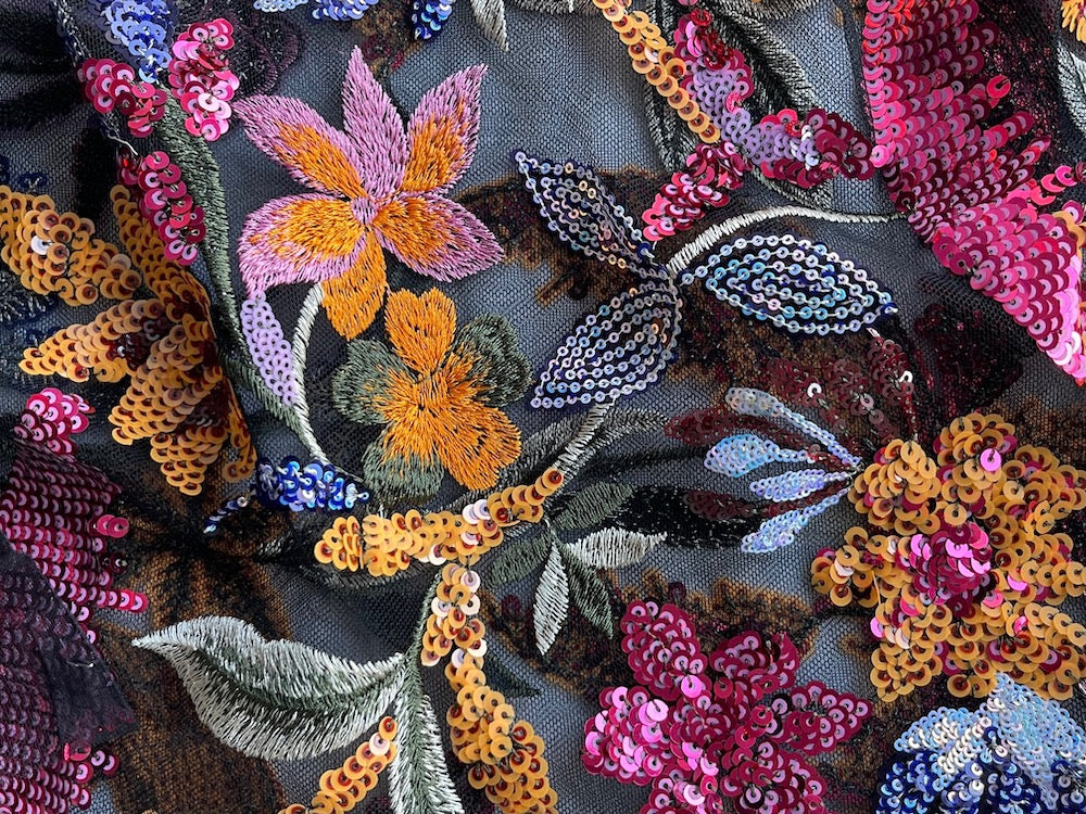 A florid sequined and embroidered fabric in an all-over design of lush jungle flowers in juicy watermelon, mango, avocado , rose, fern, and sage on black mesh - this amazing fabric is perfect for a simple fingertip top or a sheath dress. Made in Italy. Sequins on polyester mesh. 54" wide.