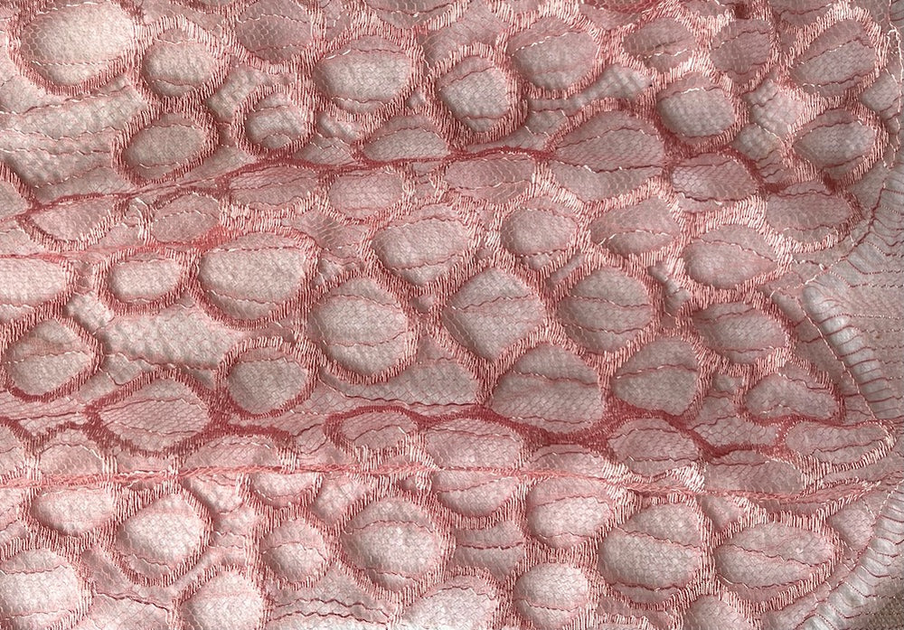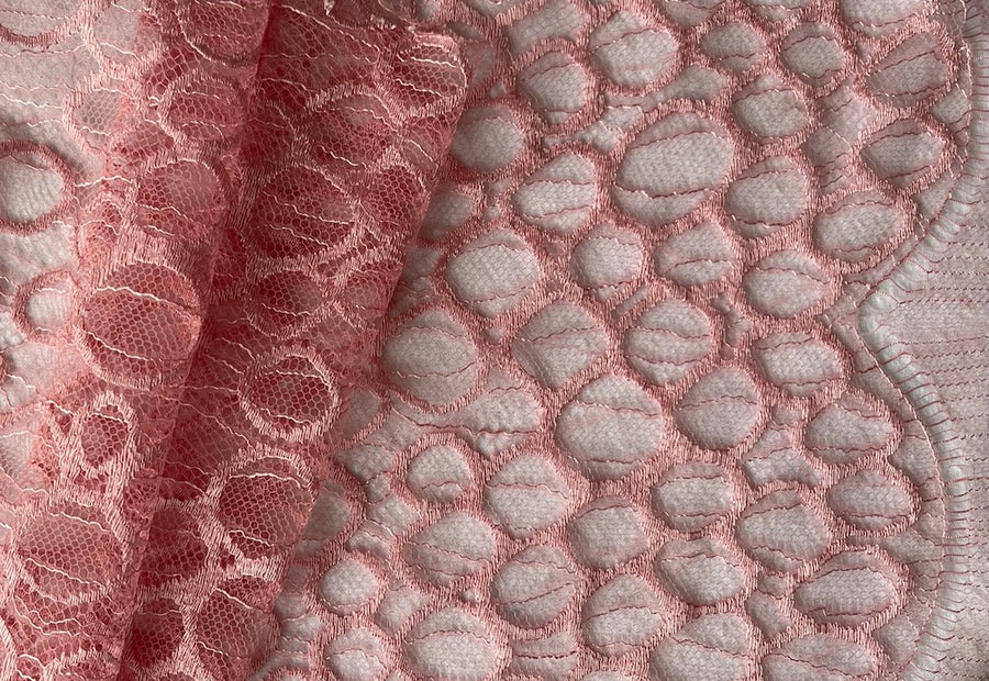 A delicate Chantilly lace fabric in sweet pink lemonade, and with graceful scallops along each selvedge - this soft, dainty lace fabric is perfect for a wrap, a blouse, or a lingerie. Made in Italy. 100% poliamide. 46" wide.