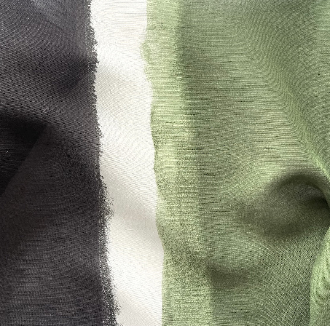 An exquisite semi-sheer linen blend with wide tourmaline, soft black, and white stripes - with 18" wide black stripes, 34" moss stripes, and narrow 1 1/2" wide white stripes, this sophisticated textured linen is perfect for an unlined swimsuit coverup, palazzo pants, curtains, or a slim sheath dress. Made in Italy. 50% linen and 50% cotton. 56" wide.