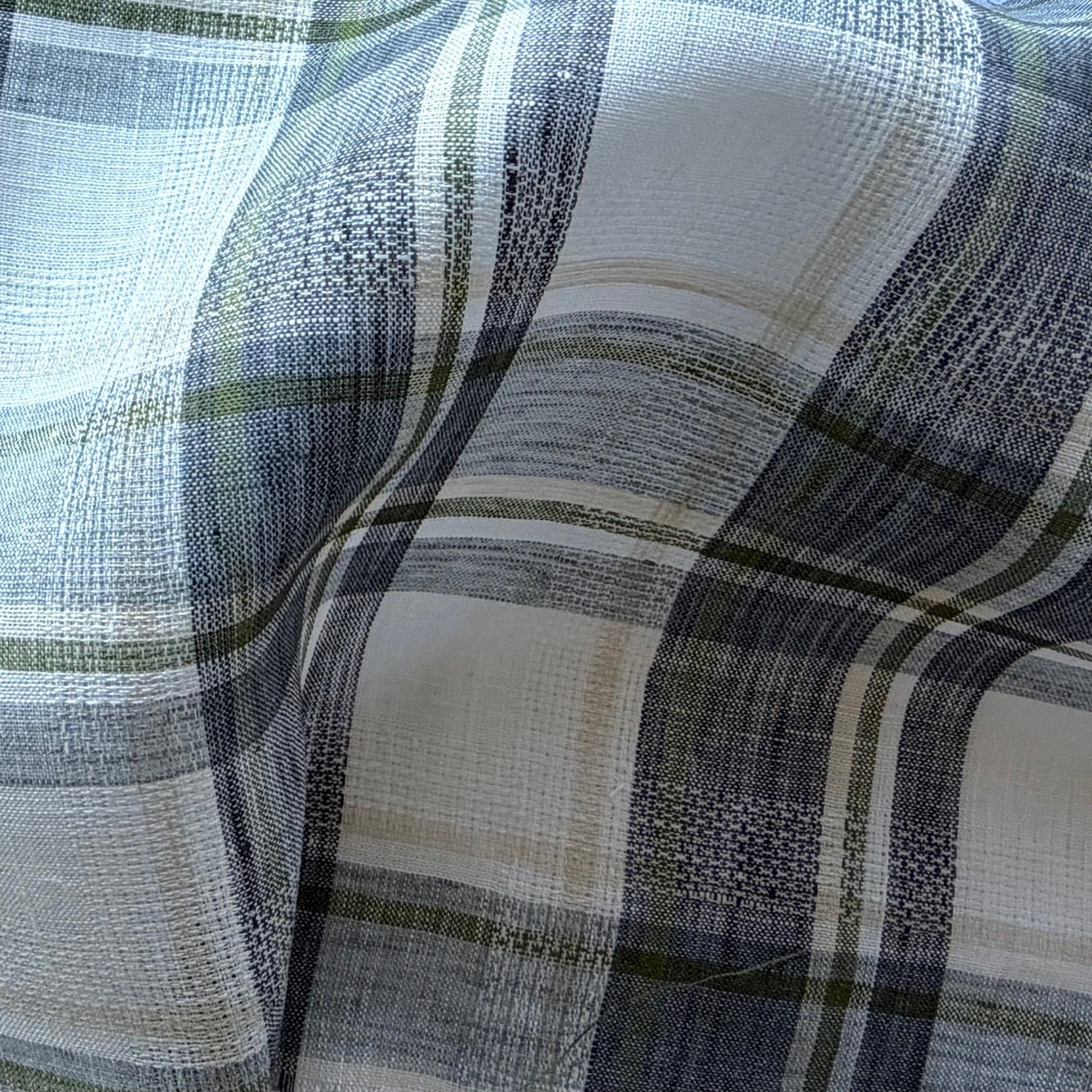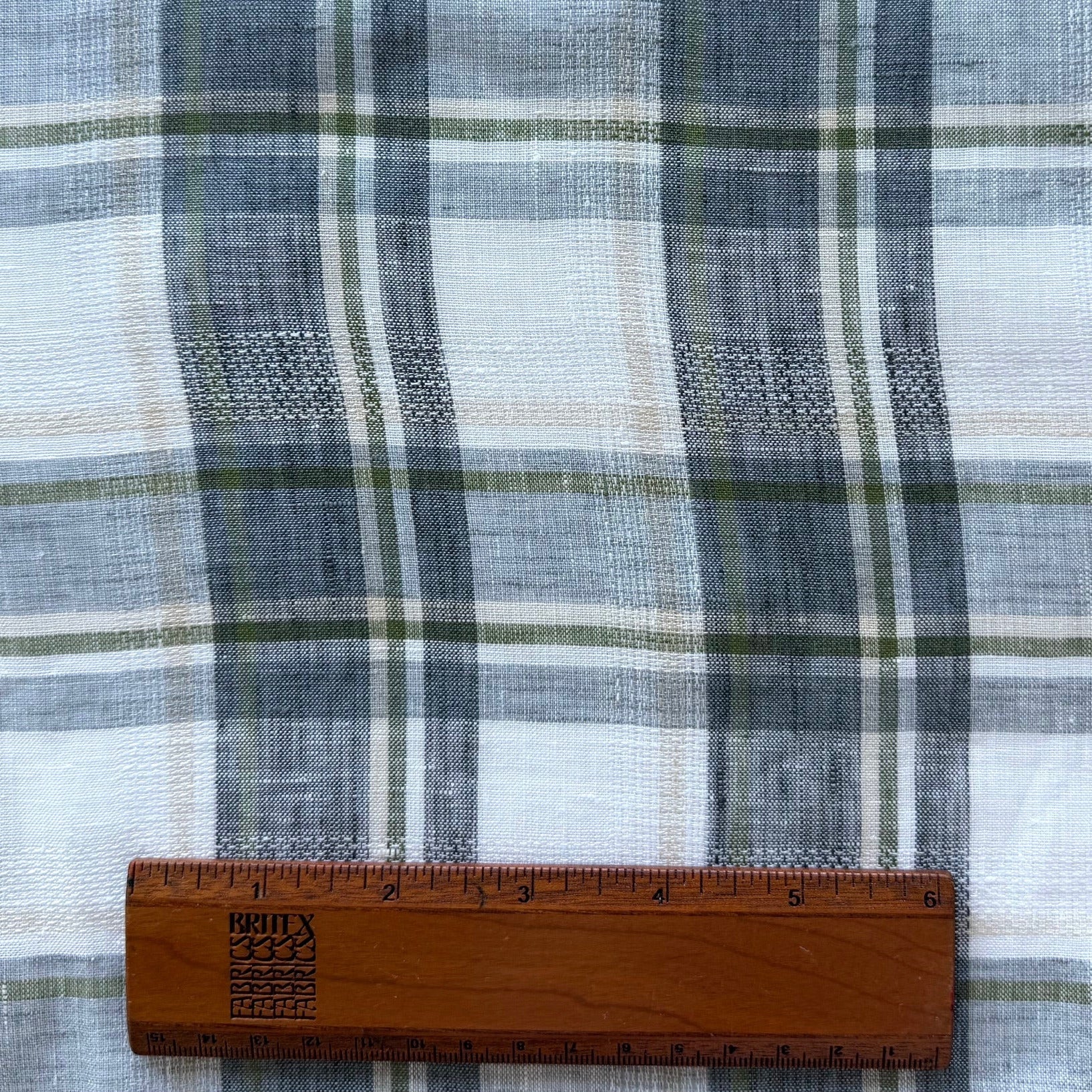 A mid-weight linen jacquard in a madras-style plaid in shades of slate gray, smoke, olive, and white - this soft linen is perfect for a summer sundress, culottes, or a loose tunic. Made in Italy and used by a well-known American designer. 100% linen. 59 wide.