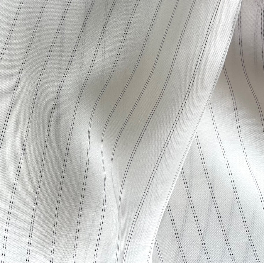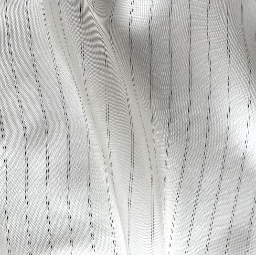 A lighter-weight rayon bemberg lining with double black pinstripes on a soft white background. Rayon Bemberg linings are our favorite lining for all fabrics including silk, wool, coats, and linen. Rayon bemberg is cool to the touch, smooth, non-cling, and cold water washable. 100% rayon viscose bemberg. 56" wide.