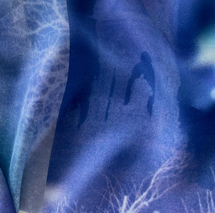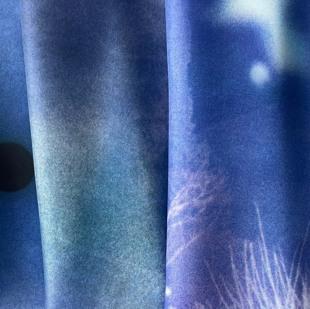 A rayon cupro lining in a moody print of bands of shadowed landscapes in shades of cornflower blue and white. Rayon cupro linings are our favorite lining for all fabrics including silk, wool, coats, and linen. Rayon cupro is cool to the touch, smooth, non-cling, and cold water washable. Suitable for lining or garments, such as blouses, skirts, or dresses.Made in Italy for a high-end English designer. 100% rayon cupro. 59" wide.