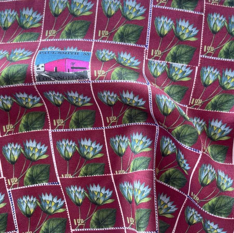 A UK designer rayon curpo lining in a print of postage stamps adorned with light blue lotus flowers on a wine-colored background. Rayon curpo linings are our favorite lining for all fabrics including silk, wool, coats, and linen. Rayon curpo is cool to the touch, smooth, non-cling, and cold water washable. Suitable for lining or garments, such as blouses, skirts, or dresses. Made in Italy for a high-end English designer. 100% rayon viscose curpo. 54" wide.