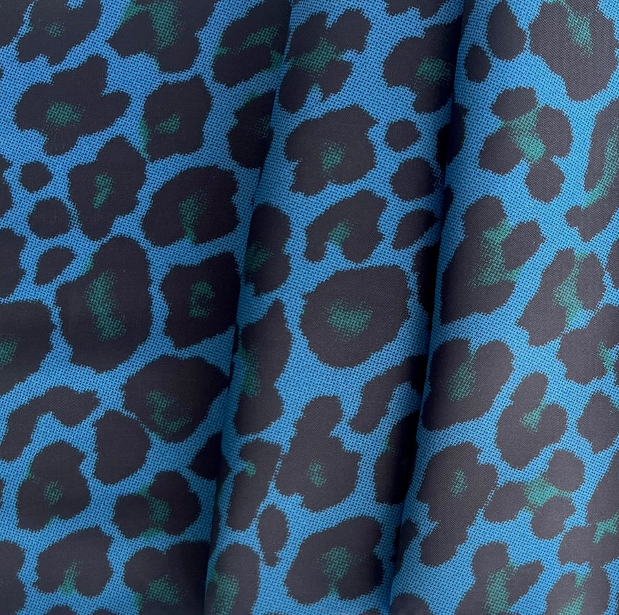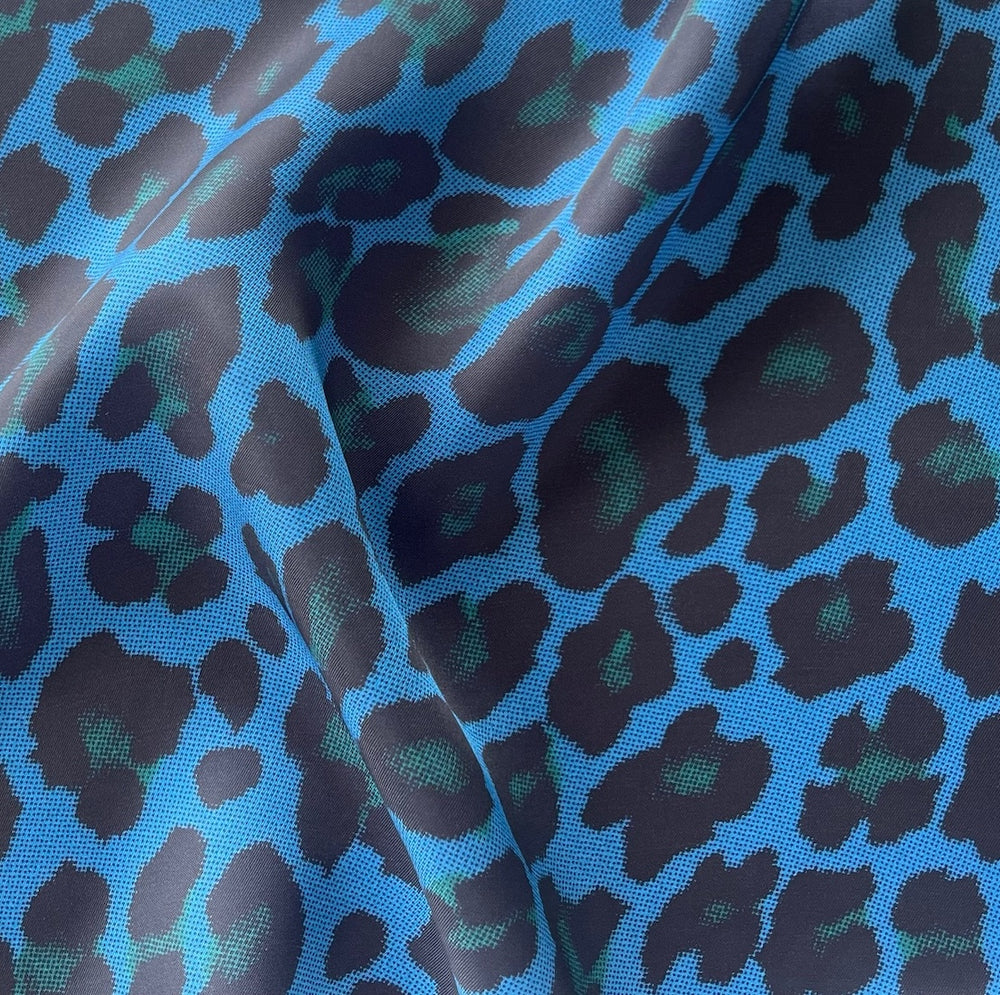 A designer rayon curpo lining in a leopard animal print in shades of blue and pine green. Rayon curpo linings are our favorite lining for all fabrics including silk, wool, coats, and linen. Rayon curpo is cool to the touch, smooth, non-cling, and cold water washable. Suitable for lining or garments, such as blouses, skirts, or dresses. Made in Italy. 100% rayon curpo. 60" wide.
