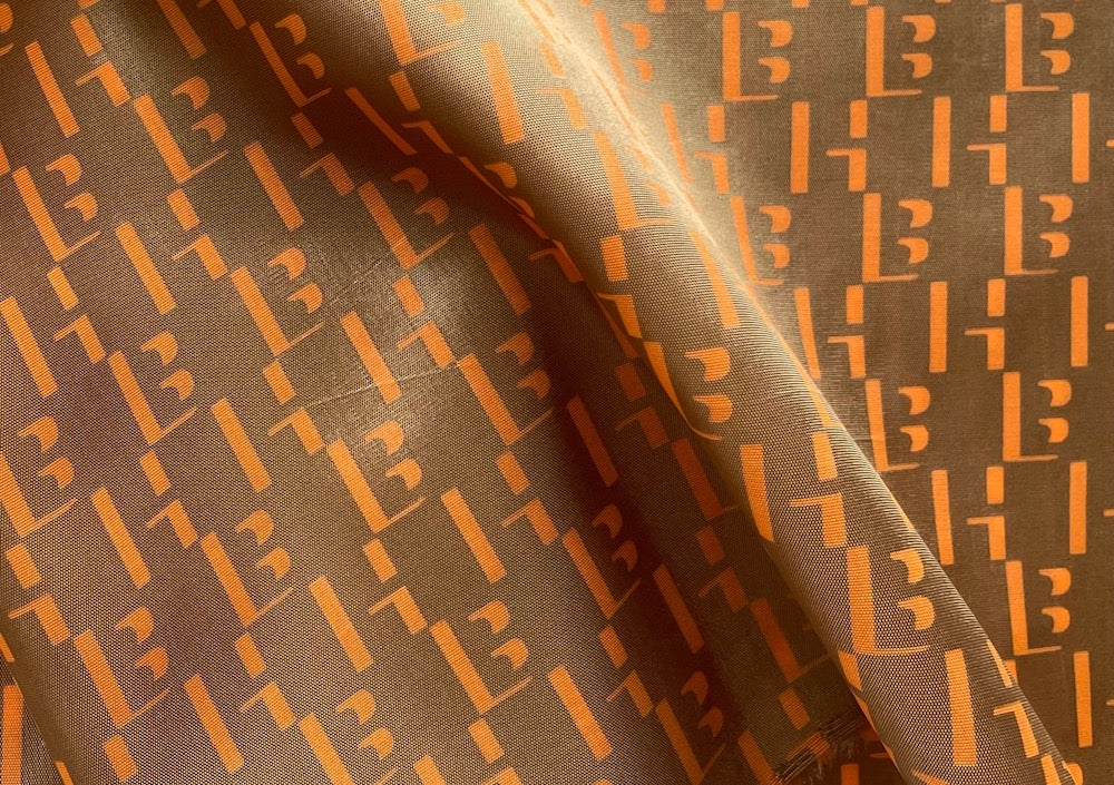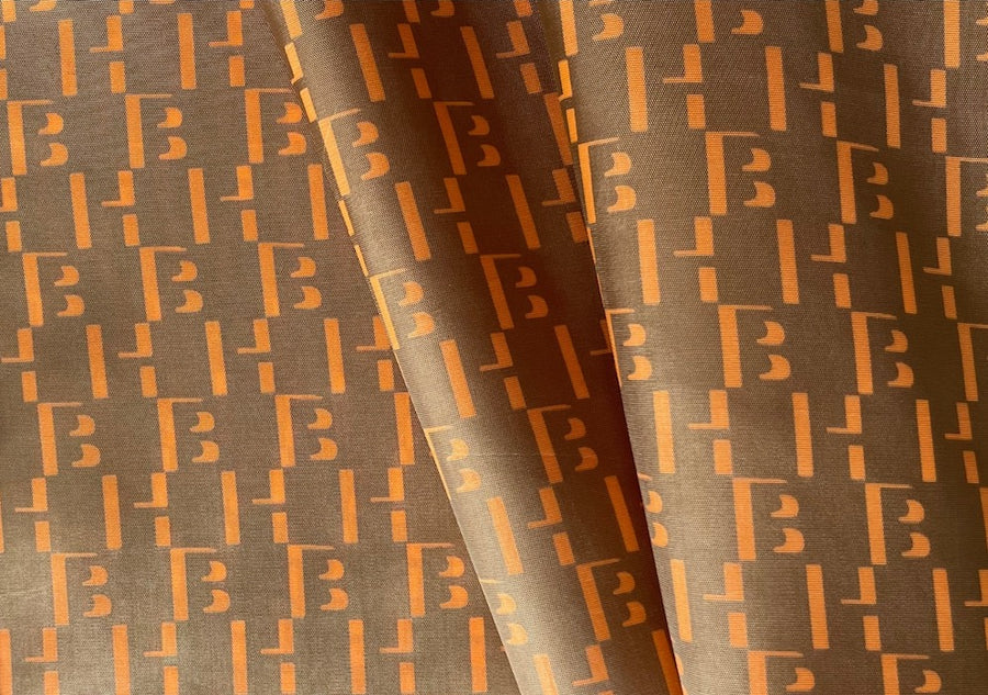 A designer rayon bemberg lining in tangerine shadowed "H"s and "B"s on a raw umber background. Rayon Bemberg linings are our favorite lining for all fabrics including silk, wool, coats, and linen. Rayon bemberg is cool to the touch, smooth, non-cling, and cold water washable. Made in Italy. 100% rayon viscose bemberg. 60" wide.
