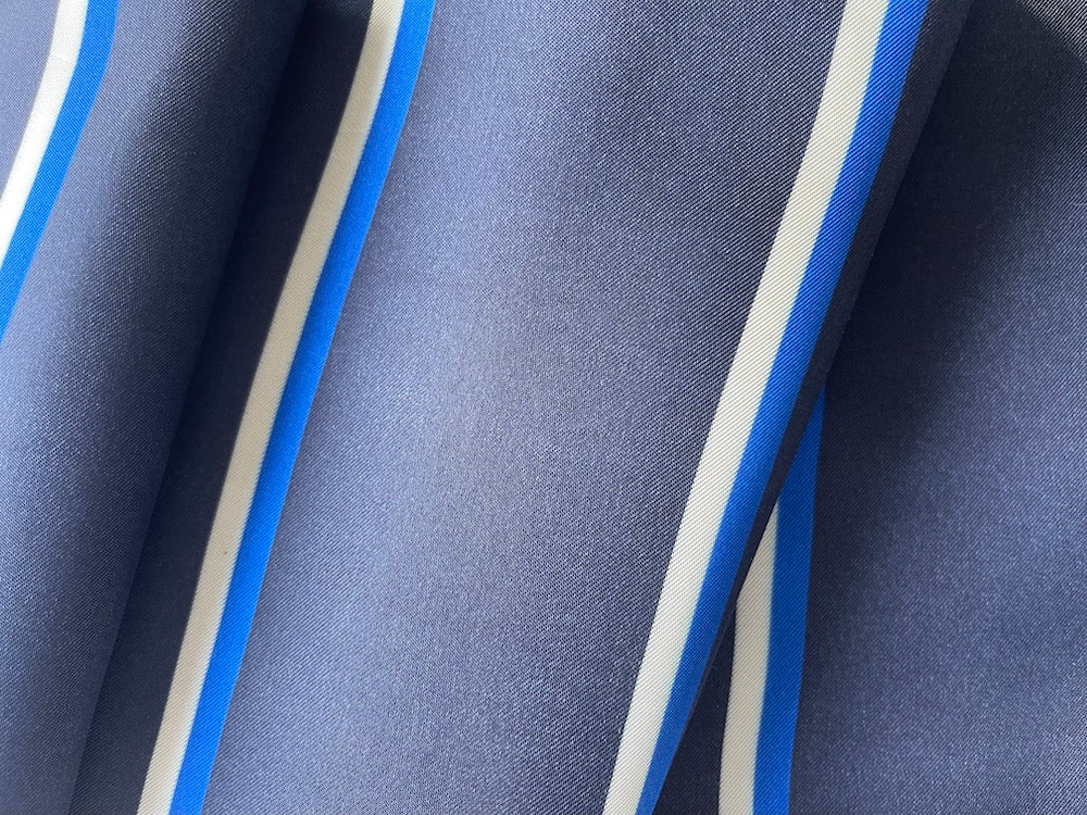 A rayon bemberg lining in a handsome navy, cobalt, and ivory stripe. Rayon Bemberg linings are our favorite lining for all fabrics including silk, wool, and linen. They're cool to the touch, smooth, non-cling, and dry cleanable. Made in Italy. 100% rayon viscose bemberg. 54" wide.