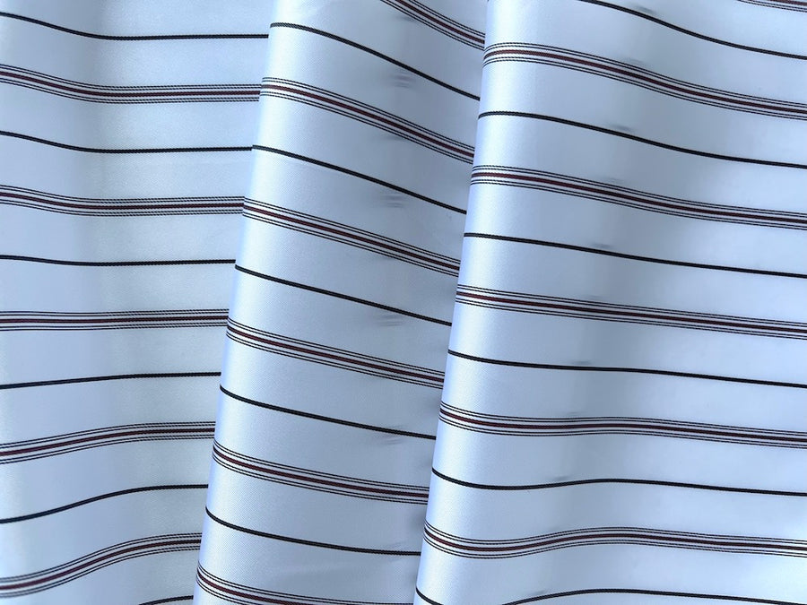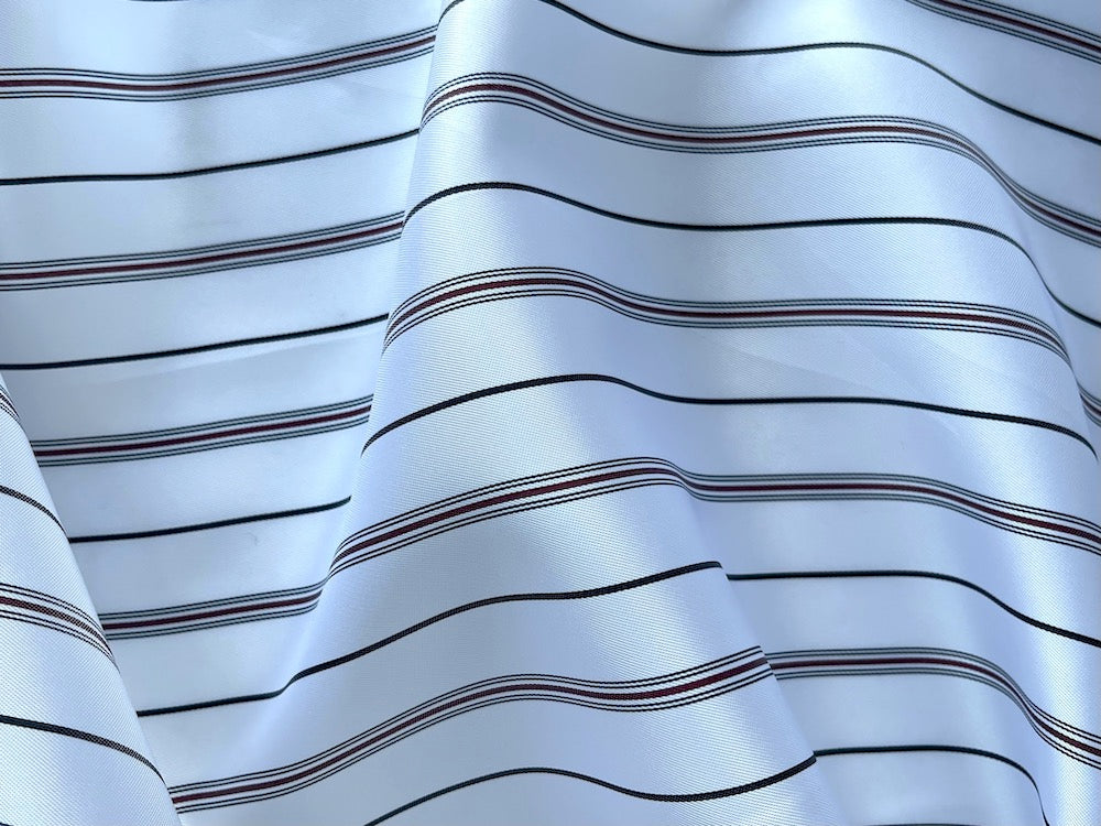 A rayon bemberg lining with crosswise black and wine stripes on a bright white background. Rayon Bemberg linings are our favorite lining for all fabrics including silk, wool, coats, and linen. Rayon bemberg is cool to the touch, smooth, non-cling, and cold water washable. Made in Italy. 100% rayon viscose bemberg. 57" wide.