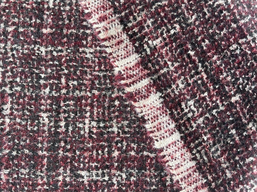 A mid-weight wool melton tweed in gloriously rich shades of deep wine, claret, and white - smooth and tightly woven, this melton is perfect for coats, jackets, and jumpers. Made in Italy and used by Hugo Boss. 100% wool. 62" wide.