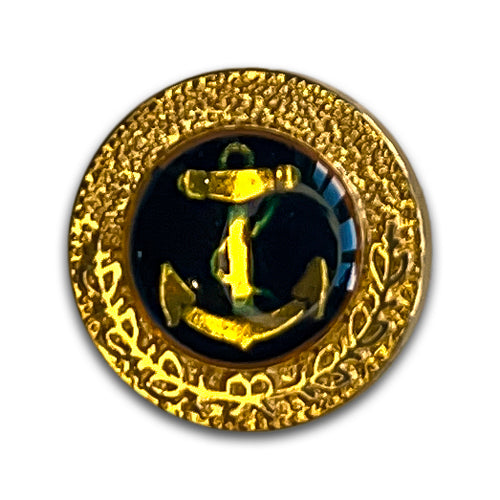 5/8" navy and bright gold enameled blazer button with a gold anchor and an embossed rim. Metal loop shank backing. Made in Germany.