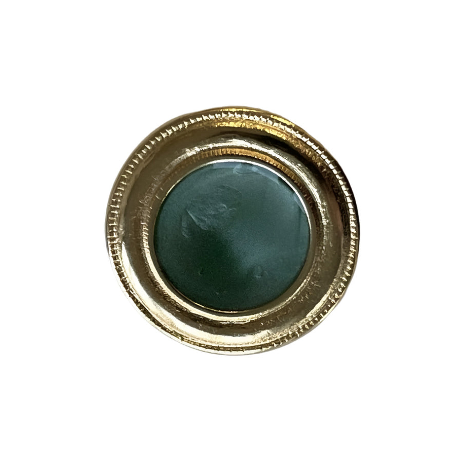 A gold metal button in conifer green center and a simple beaded gold rim. Metal shank backing. Made in Spain.