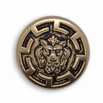 Antique gold metal button with a Versace-style lion design and modified Greek key rim. Metal shank backing. Made in Switzerland.