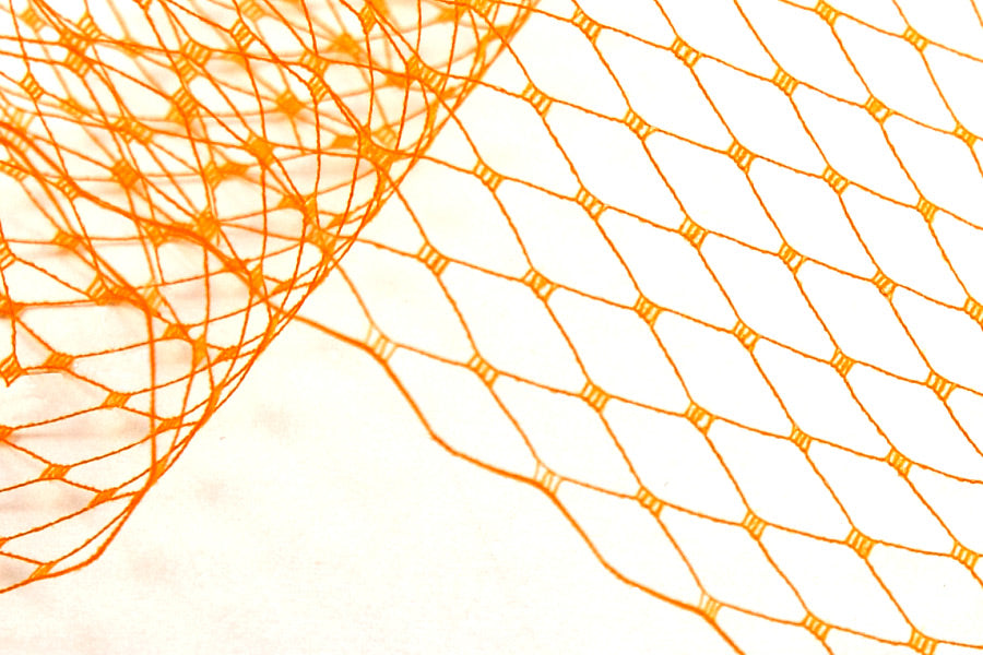 9" wide veiling in racy orange This lovely millinery veiling is called Russian/French veiling or netting. It is perfect for making romantic bridal birdcage veils, trimming sophisticated hats, accessorizing fascinators, or adding a charming vintage touch to historical costumes. This nylon veiling is 9” wide, with 1 cm. wide diamond shaped openings, narrowly scalloped edges, and is sold by the yard and increments per yard. The minimum order is 1 yard.