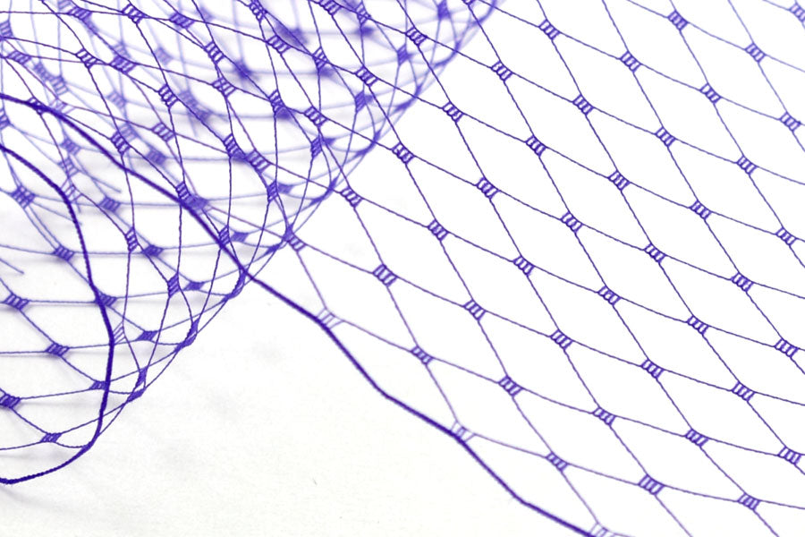 9" wide veiling in royal purple. This lovely millinery veiling is called Russian/French veiling or netting. It is perfect for making romantic bridal birdcage veils, trimming sophisticated hats, accessorizing fascinators, or adding a charming vintage touch to historical costumes. This nylon veiling is 9” wide, with 1 cm. wide diamond shaped openings, narrowly scalloped edges, and is sold by the yard and increments per yard. The minimum order is 1 yard.