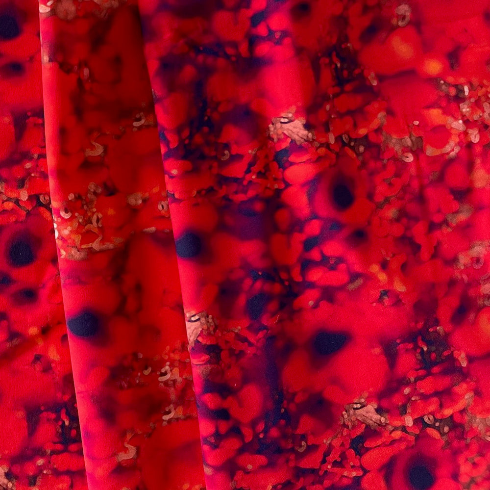 A designer, lighter-weight polyester jersey knit in an abstract print in fiery shades of coral, candy red, eggplant, and tangerine - with a touch of lycra, this spectacular, non-wrinkle, matte finish knit is great for travel-wear, a blouse, a swimsuit, leggings, or a wrap top. Made in Italy and used by Chiara Boni. 70% polyester and 30% lycra. 59" wide.