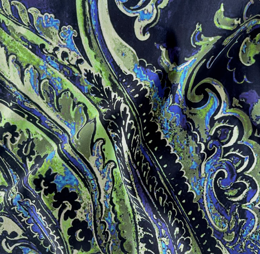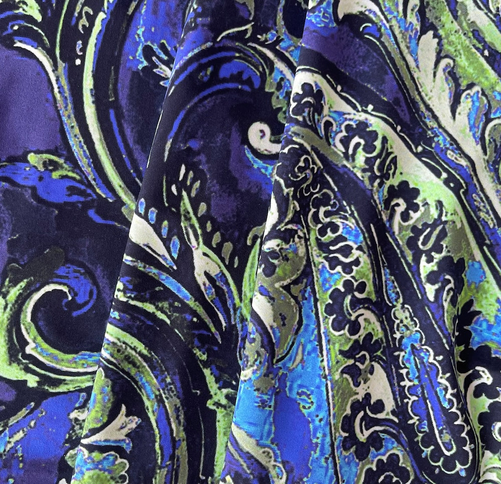 A designer, lighter-weight polyester jersey knit in a large-scale paisley print in ocean shades of sea green, plum, seaweed, black, and blues - with a touch of lycra, this spectacular, non-wrinkle, matte finish knit is great for travel-wear, a blouse, a swimsuit, leggings, or a wrap top. Made in Italy and used by Chiara Boni. 70% polyester and 30% lycra. 54" wide.