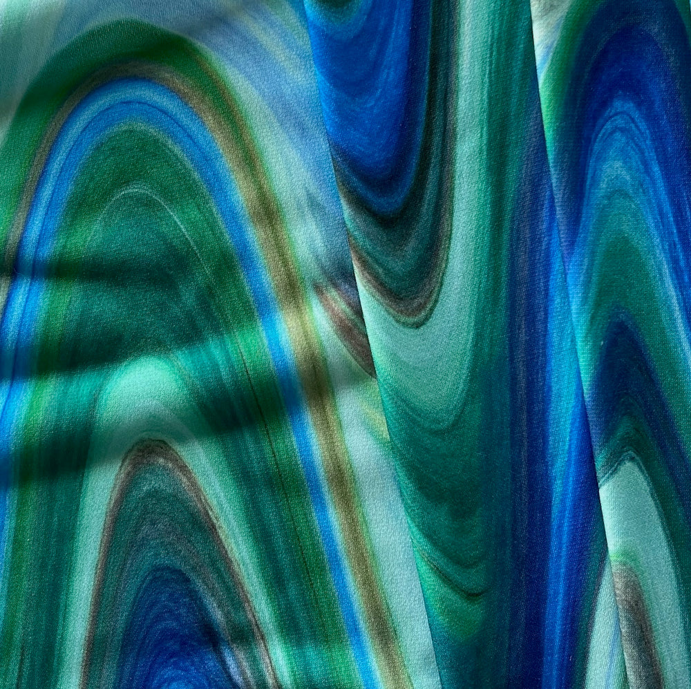 A lighter-weight polyester jersey knit print of waves in watery shades of cobalt, emerald, and seaweed - with a touch of lycra, this knit is great for travel, a blouse, a swimsuit coverup, or a wrap top. Made in Italy. 95% polyester and 5% lycra. 60" wide.