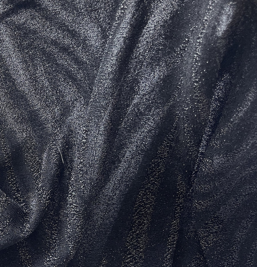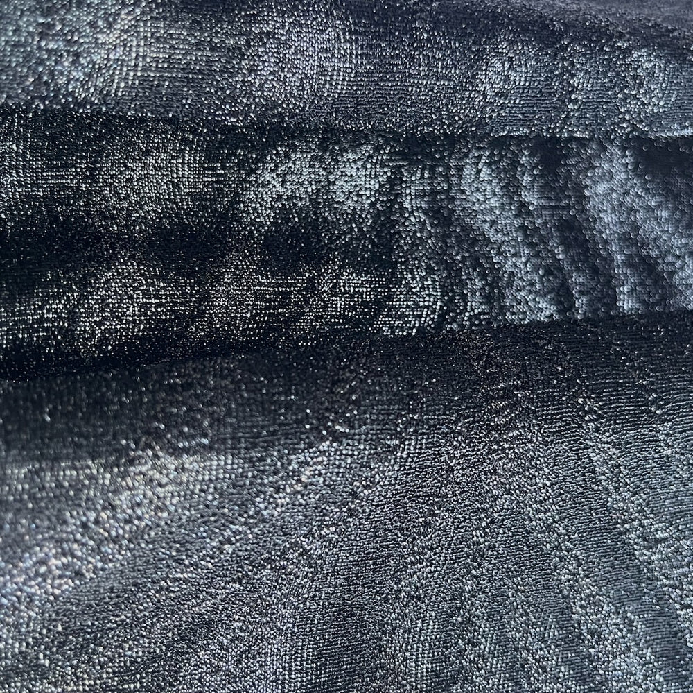 A semi-sheer, light-weight polyester knit of a metallic jet black tone-on-tone tiger stripe - with a touch of lycra, this elegant drapey knit is a tad heavier than a mesh and great for travel, a blouse, a swimsuit coverup, or a wrap top. Made in Italy. 80% polyester, 15% acrylic, and 5% lycra. 66" wide.