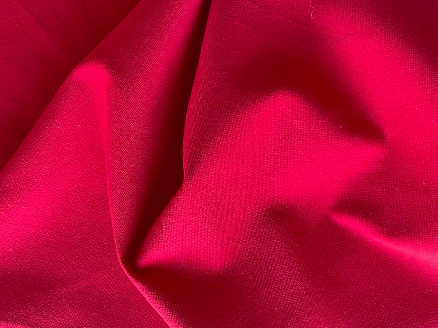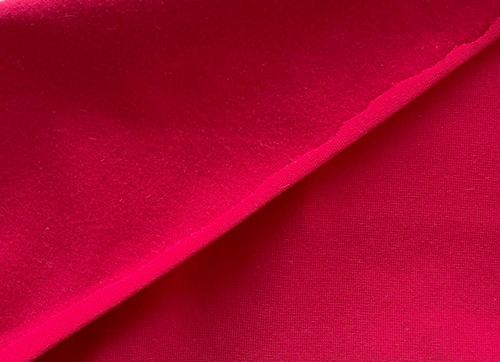A mid-weight 4-way stretch nylon supplex knit in vivid tango red - a lightly backed fleece, this is perfect for comfy tops, sweats, and lounge-wear. Made in USA. Nylon and lycra blend. 60" wide.
