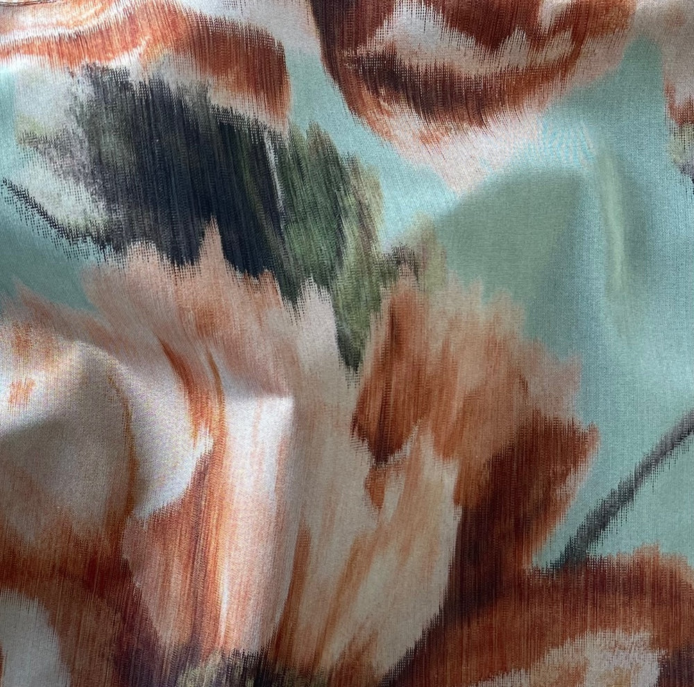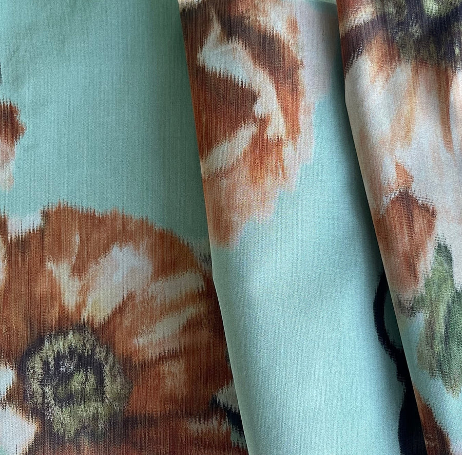 A crisp polyester taffeta in a charming large-scale floral in shades of ginger and olive on an Aqua Sky background- delightful for a wrap, tailored jacket, or a hostess skirt. Made in Italy. 100% polyester. 58" wide.