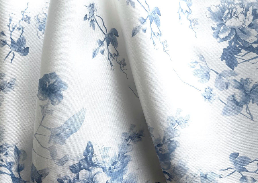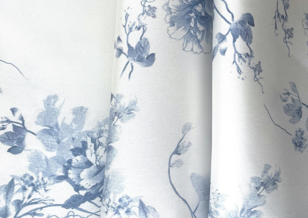 A crisp polyester mikado twill in a large-scale floral print in shades of steel and navy blue on a bright white background - similar to a stiffer organza and opaque, this silk-like, shapely fabric is similar in weight to silk dupioni and wonderful for fitted corsets, structured ball gowns, wraps, or full skirts. 100% polyester. 58" wide.