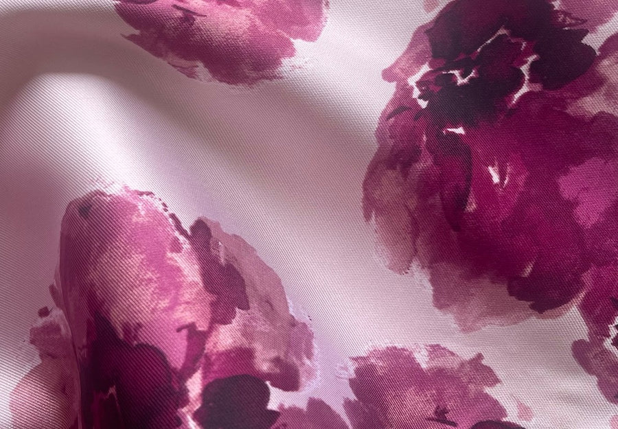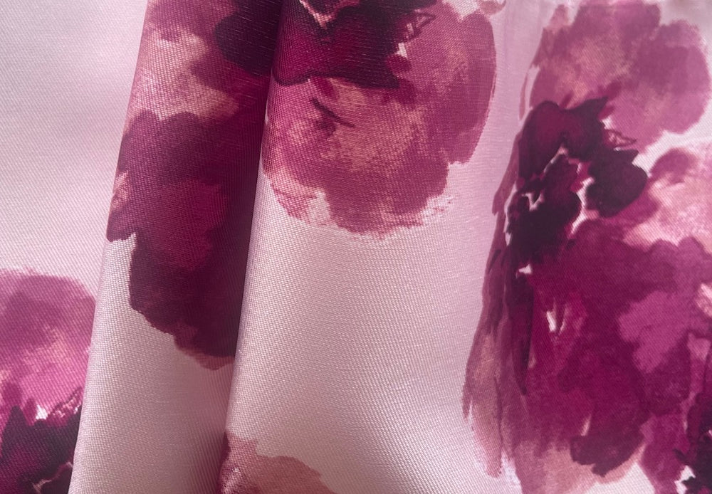 A crisp polyester mikado twill in a lushly romantic print of splashy flowers in shades of wine on a peppermint pink background - similar to a stiffer organza and opaque, this silk-like, shapely fabric is similar in weight to silk dupioni and wonderful for fitted corsets, structured ball gowns, wraps, or full skirts. 100% polyester. 58" wide.