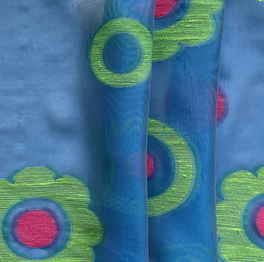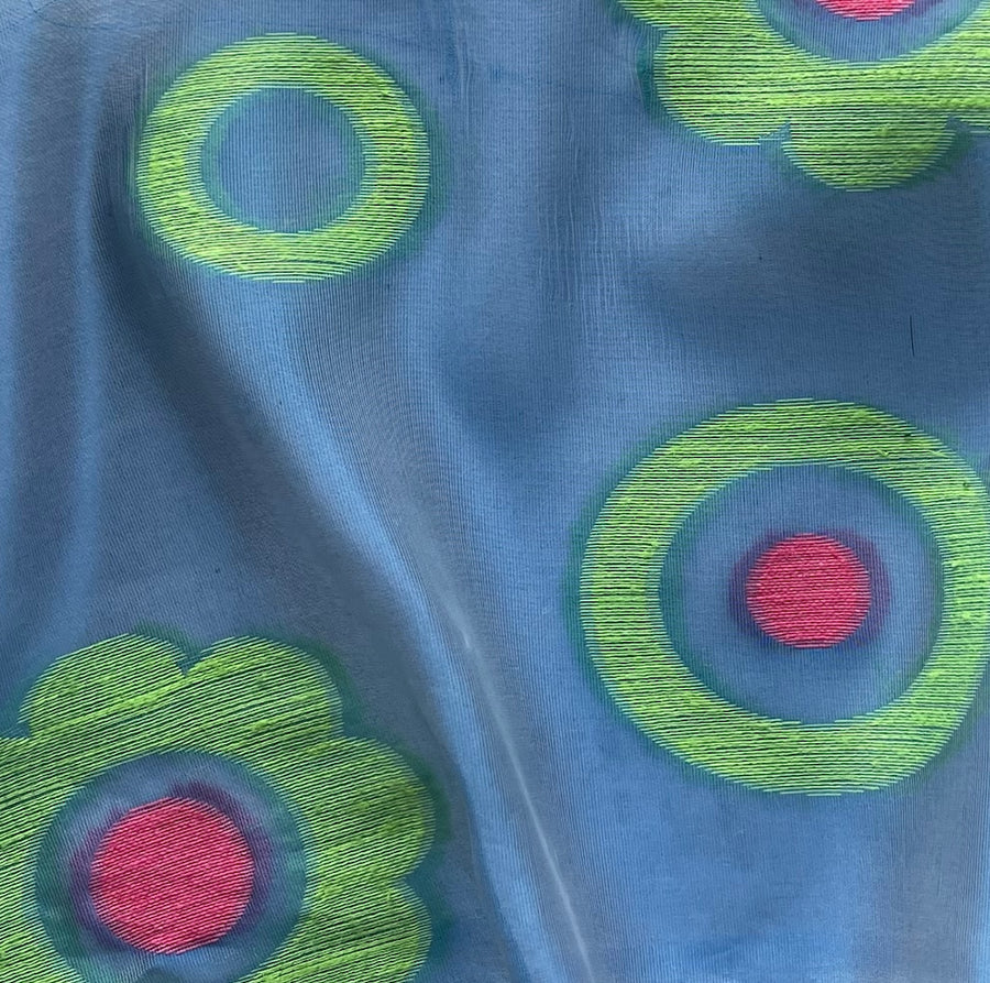 A lovely embroidered polyester blend organza with perky French pink and deep pistachio flowers and circles embroidered on an azure background - this playful semi-sheer fabric is perfect for a boho blouse, a flowing dress, or a swimsuit coverup. Polyester and nylon. 58" wide.