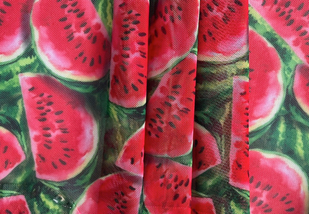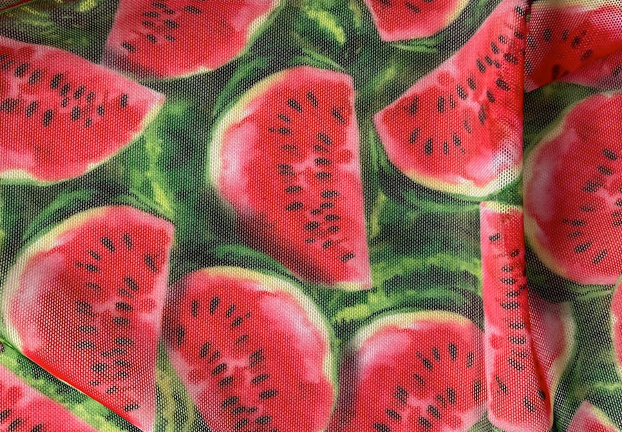A semi-sheer stretch polyester blend mesh in a refreshing summery print of juicy watermelons - perfect for layering, floaty tops, or sleeves. Made in Italy. Polyester, nylon, and lycra blend. 57" wide.