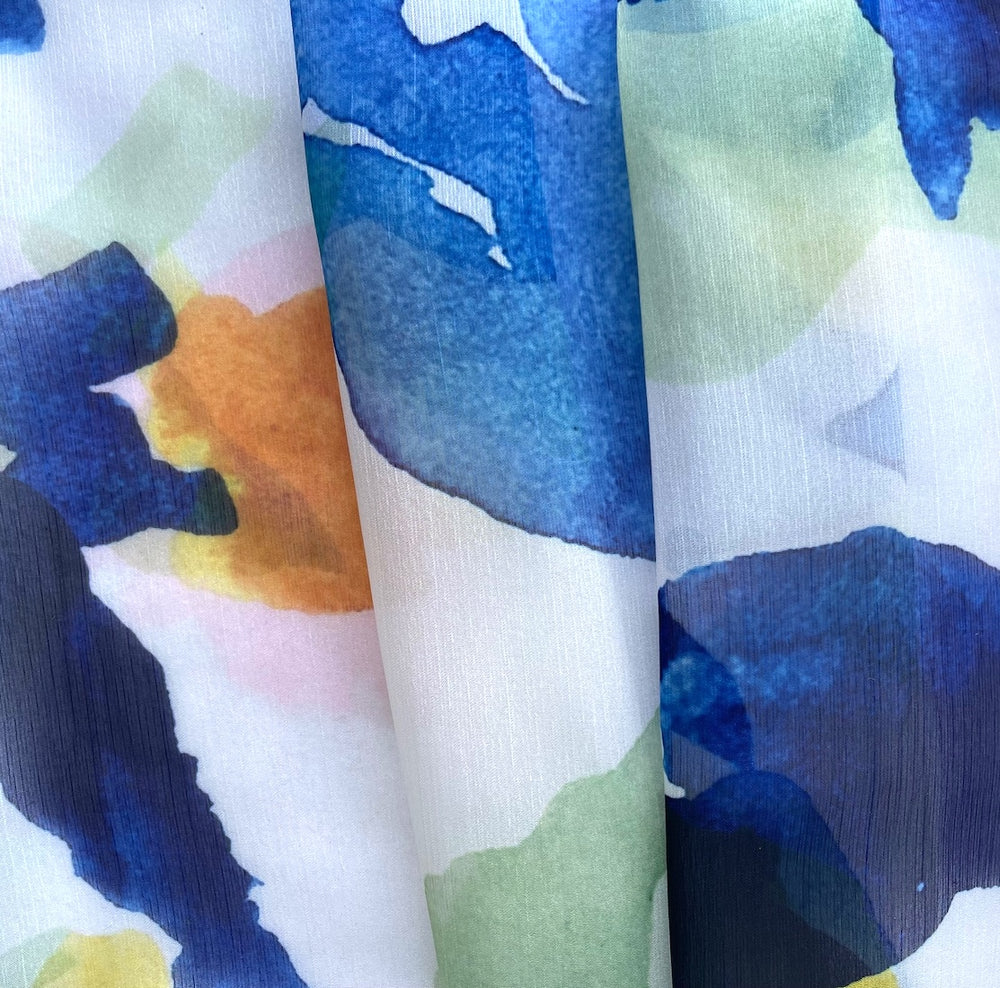 A semi-sheer crinkled polyester chiffon with an abstract pattern in shades of mandarin orange, cobalt,mint, and butterscotch on a cloud white background - this airy chiffon is perfect for a boho blouse, a flowing dress, or a top. 100% polyester. 58" wide.