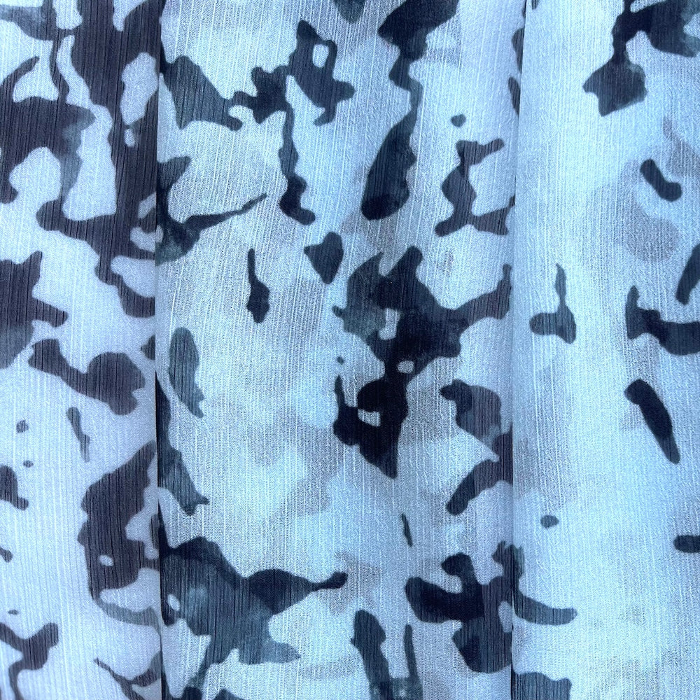 A semi-sheer crinkled polyester chiffon with an abstract pattern of raven black colored splatters on a light sky blue background - this airy chiffon is perfect for a boho blouse, a flowing dress, or a top. 100% polyester. 58" wide.