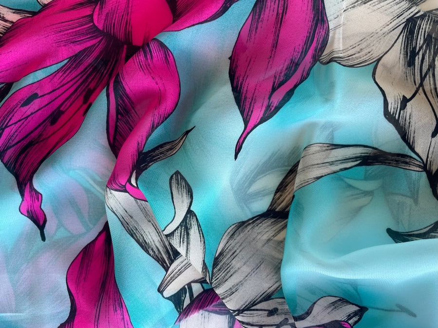 A polyester georgette in large-scale print of vivid fuchsia day lilies on a variegated aqua background - smooth, soft, drapeable, and perfect for a caftan, bathing suit cover-up, or a gathered maxi-skirt. Made in Italy. 100% polyester. 59" wide.