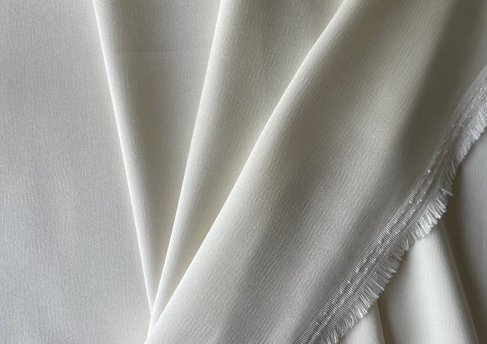 A mid-weight, gleaming polyester crepe back satin in pale bone - with a hint of stretch, this smooth, shimmering crepe back satin is perfect for dridalwear, slinky tops, glamorous drawstring pants, or a chic dress. Made in Japan. 97% polyester and 3% lycra. 60" wide.