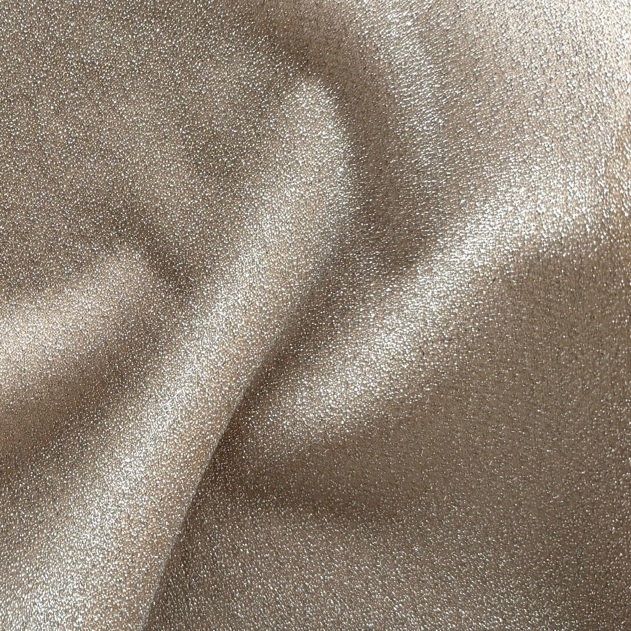 A semi-sheer polyester mesh-type knit in golden bisque with a silver metallic shimmer - this loosely woven knit is perfect for sleeves, special occasions, or costumes. 100% polyester. 64" wide.