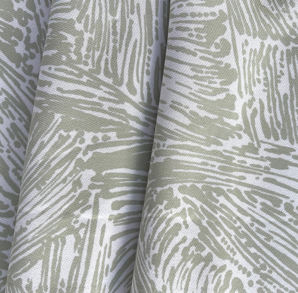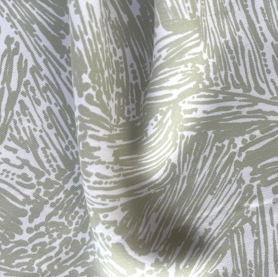 A mid-weight, stretch rayon viscose in a flowing abstract print in sage green and white - with a touch of lycra, this summery, drapey rayon crepe is perfect for a sheath dress, a cowl neck blouse. tunic, or a long skirt. Made in Italy. 95% rayon viscose and 5% lycra. 52" wide.